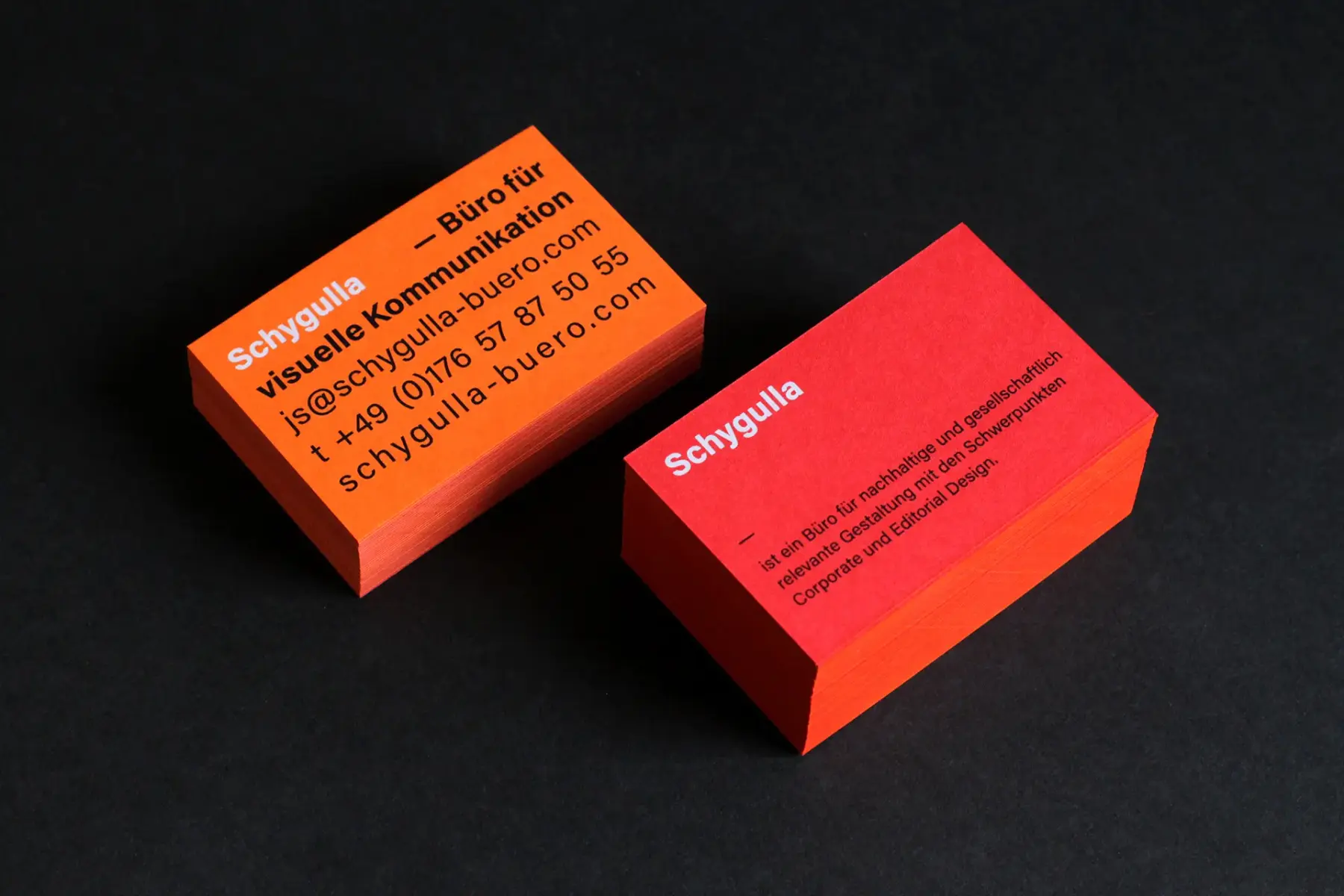 Geschäftsausstattung in eigener Sache: Duplex-Visitenkarten mit matt-weißer Heißfolienprägung auf Colorplan Mandarin und einseitig geprägtem Colorplan Brocade Bright Red Papier. Rote, mit Schlitzen versehene DinLang-Karten dienen als Halter für die Visitenkarten beim Post-Versand. Für die Briefbögen wurde Colorplan Cool Grey verwendet, dazu unbedruckte transparente Briefumschläge. Die verwendeten Farben finden sich auch auf der Webseite wieder. Während die Visitenkarten in Rot und Orange auffallen sollen, nimmt sich die Gestaltung ansonsten zurück und nutzt die Farbtöne hauptsächlich zur Hervorhebung. Das Design kommt ohne Bildmarke aus — die im Block gesetzte Typografie und das Zusammenspiel der Materialien sorgt für die nötige Kontinuität.
