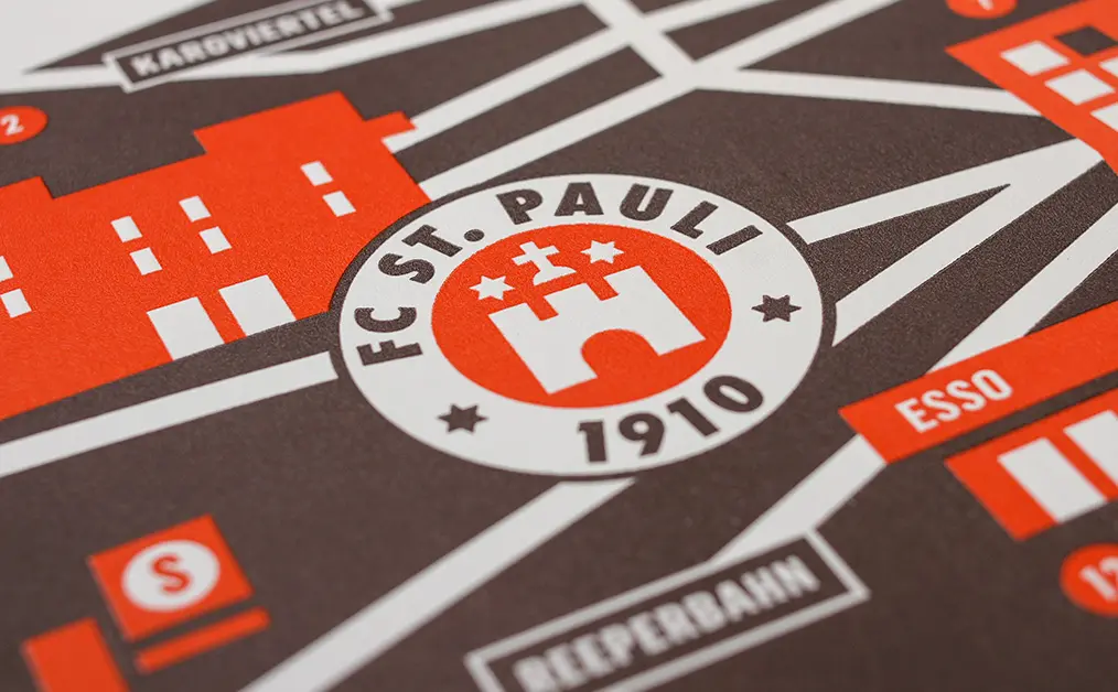 Anlässlich der diesjährigen Millerntor Gallery im gleichnamigen Fussballstadion wurde der einzig mögliche Stadtteil Hamburgs vom 2erpack kartografiert. Heraus gekommen ist ein überformatiges Wandbild mit Fussboden-Elbe und Schal-Bismarck sowie die offizielle Kunstdruck-Edition zum Event, gedruckt von unserem guten Letterpress-Freund Gerrit Baumann für Officina Polychroma.