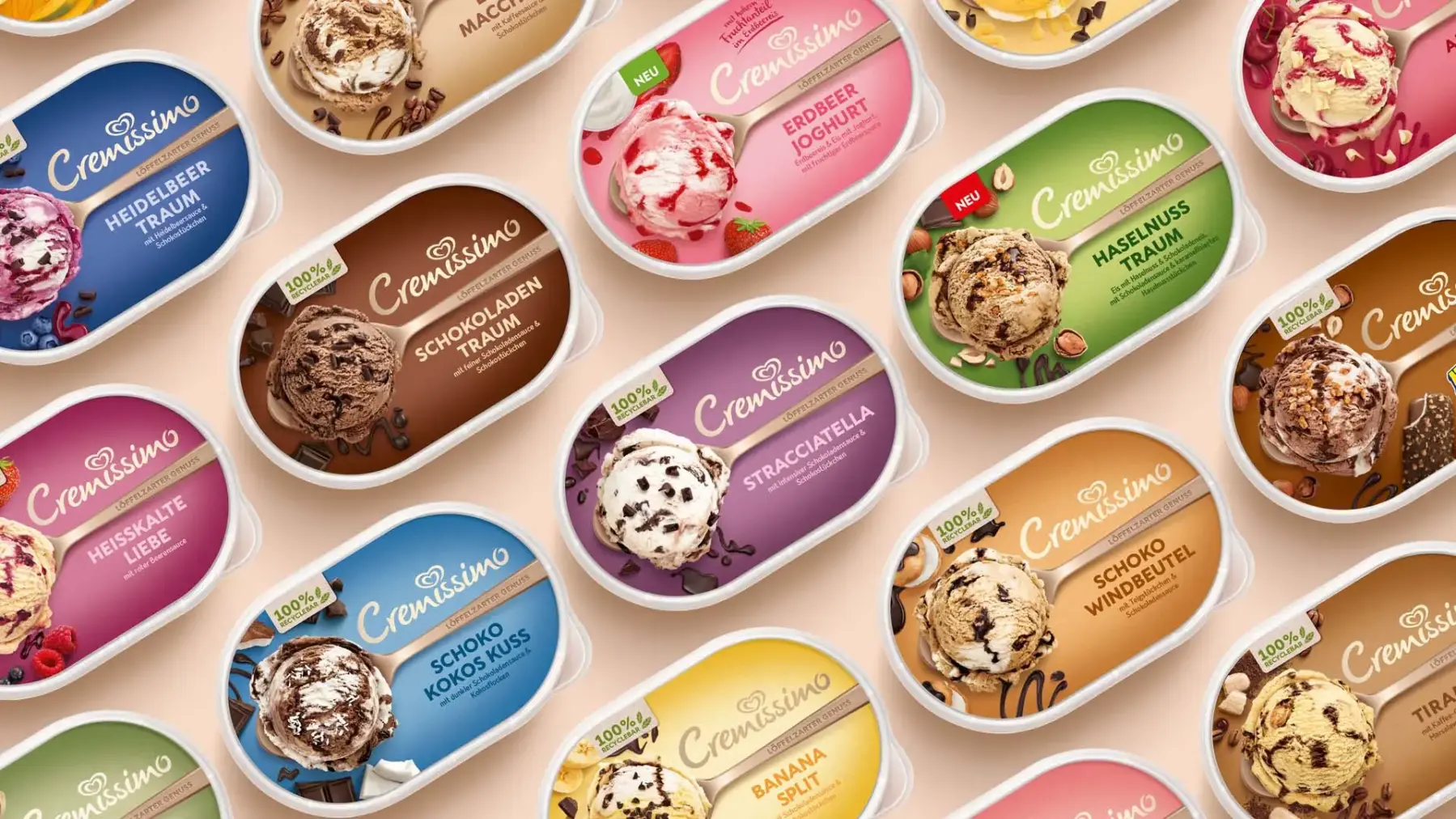 Das Ziel der Designentwicklung war es, die positive Wahrnehmung der Marke zu stärken und ihr neues Selbstbewusstsein zu verleihen. Das Verpackungsdesign sollte die besondere Cremigkeit hervorheben und auch jüngere Konsumenten erreichen, um Cremissimo für die Zukunft gut aufzustellen. Vor allem sollte das Thema Nachhaltigkeit kommuniziert werden: Die Packungen sind zu 100 % recyclebar. Cremissimo macht sich stark für einen geschlossenen Plastikkreislauf und das sollte deutlich auf der Packung ausgelobt werden.
