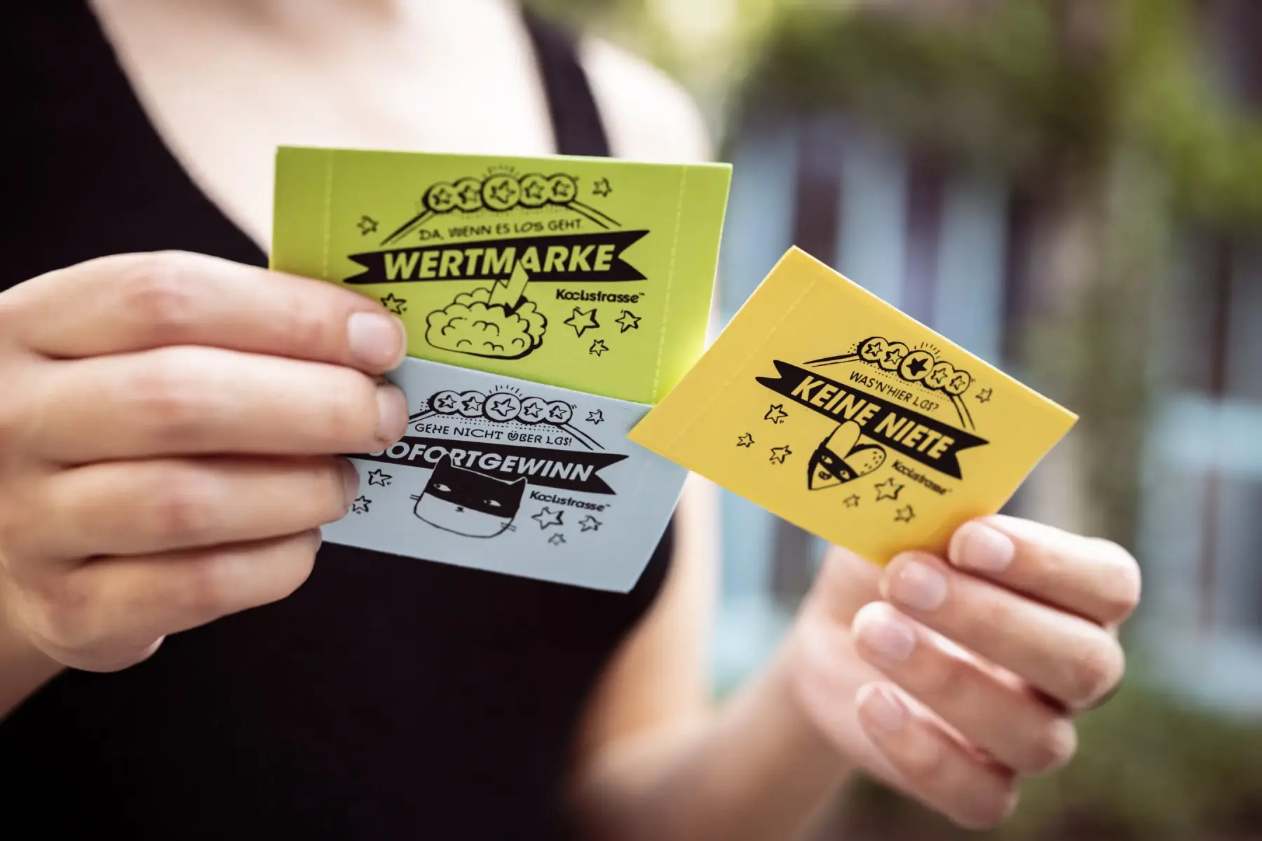 Getreu unserer Mission „Rummel im Kopf und Furore auf den Fluren“ haben wir unsere bis dato schon sehr geilen Visitenkarten noch mal upgelevelt – ein 3er-Pack-Brieflose ermöglicht im (Neu-)Kundendialog oder Austausch oder beim Netzwerken auf Veranstaltungen und Events eine prägende Assoziation auf den Kern der Agentur: Kreativität. Die zweckentfremdeten Visitenkarten funktionieren wie folgt: Eine ist ein Sofort-Gewinn für eine Brause oder ein Bier in der Agentur, eine stellt die Agentur vor und aktiviert auf den Newsletter und die letzte Ist Gewinn und Kontakt gleichzeitig. Kontaktdaten und das Versprechen, dass eine Stunde „Rummel im Kopf“ frei ist. Somit ist das 3er-Set eine Art „Incentive-Dialog-Playful-Business-Cards“.