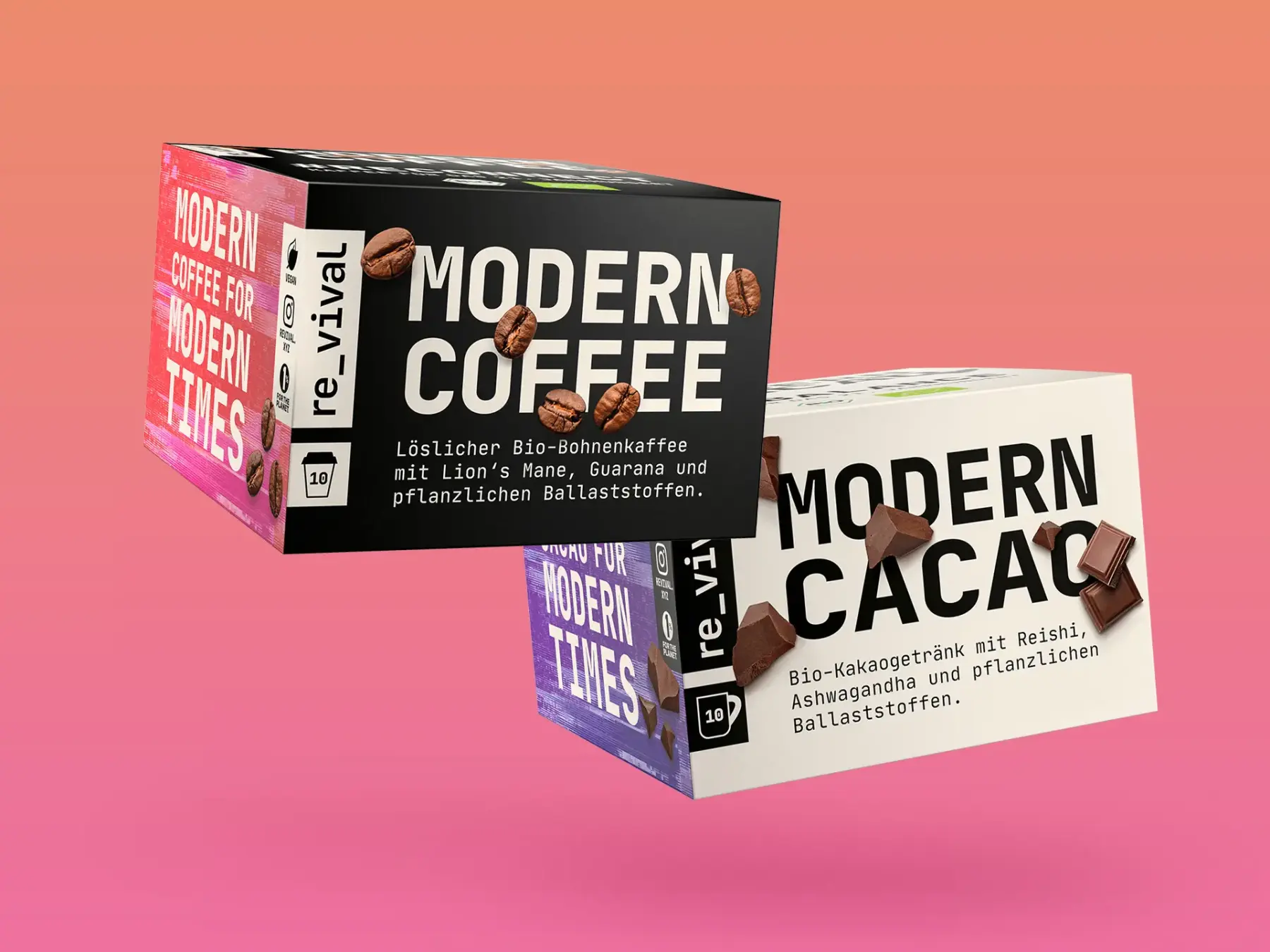 The brand plays with the aesthetics of the digital on a very analog product in many ways – always asking the question of why everything in our digital world constantly receives updates but the way we drink our coffee everyday does not. The logo incorporates the idea of building a bridge between these two worlds in the quite literal way of an underscore. In the digital version of the wordmark the underscore is animated and transports the feeling of a blinking cursor – the waiting, the in between the „what’s next?“. The Revival products are made for these exact moments: Have a modern coffee with less caffeine but more superfoods to reconnect with your ability to focus. All without the jitteriness of normal coffee. Or rebalance and rewind with a modern cacao with reishi and ashwagandha before going to bed, when ending your work day or whenever you need a break.