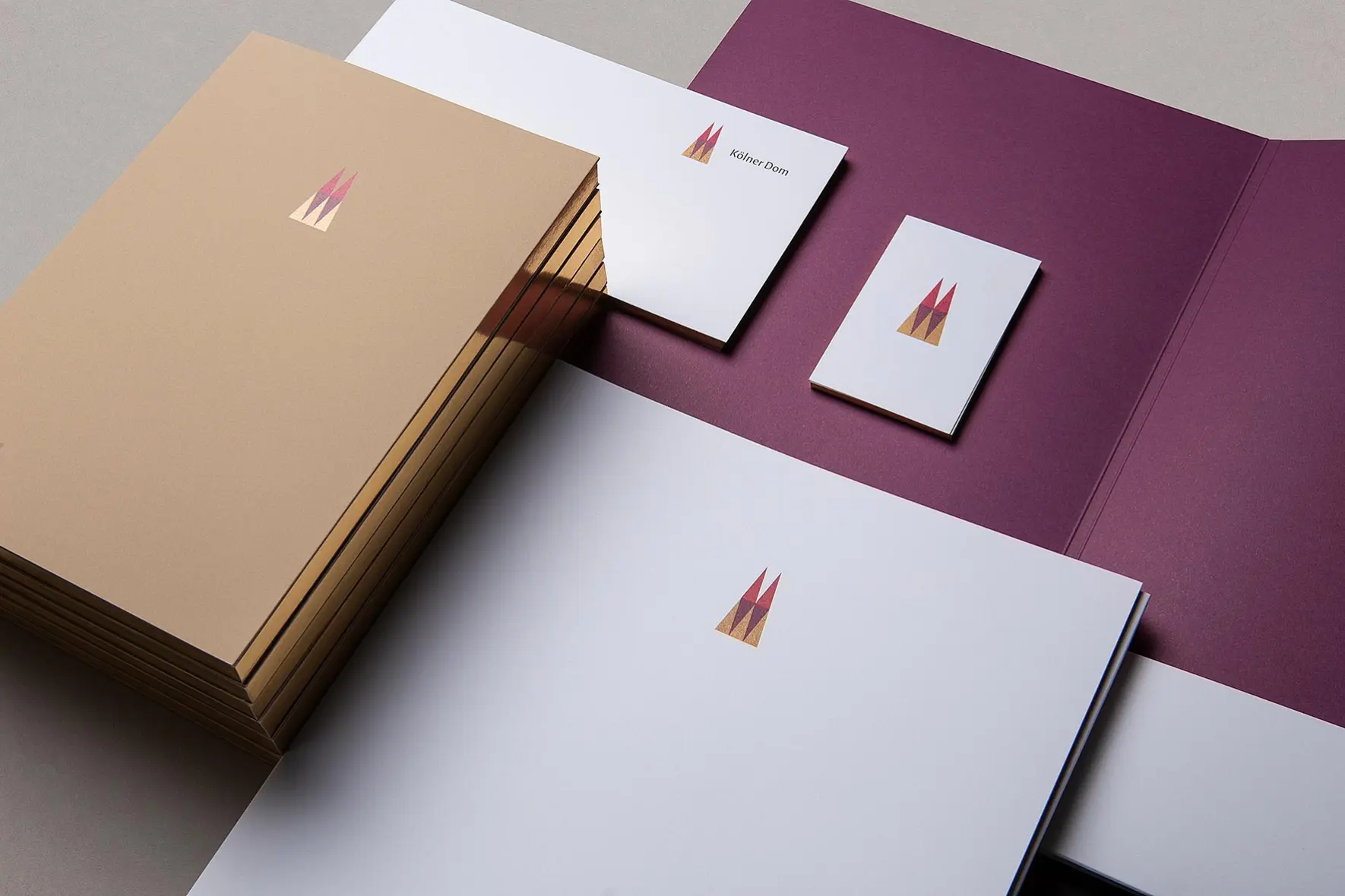 “Weltweit bekanntes Gotteshaus, Wahrzeichen der Stadt, Weltkulturerbe, … die Aufgabenstellung, für den Kölner Dom eine visuelle Identität zu schaffen, war in vielfacher Hinsicht herausfordernd. Und das nicht nur, weil diese Markenentwicklung besonders kritisch hinterfragt werden würde. Die Westfassade mit ihren markanten Doppeltürmen ist weltweit bekannt und damit in den Köpfen vieler Menschen als Bild fest verankert. In der Herangehensweise an ein neues Erscheinungsbild für den Kölner Dom kann die Grundform der Doppeltürme also nicht ignoriert werden. Gleichzeitig weisen die beiden Spitzen alleine nicht genügend Eigenständigkeit auf, da es in und um Köln Hunderte von Erscheinungsbildern mit eben diesen beiden Spitzen gibt. Weltweit weniger bekannt ist, dass diese Kathedrale um den Schrein der Heiligen Drei Könige herum erbaut worden ist. Das neue Signet des Kölner Doms führt nun in sieben symbolträchtigen gleichschenkligen Dreiecken die Doppeltürme und den Gründungsimpuls zum Bau des Doms – die Heiligen Drei Könige – in seiner stilisierten Form zusammen.