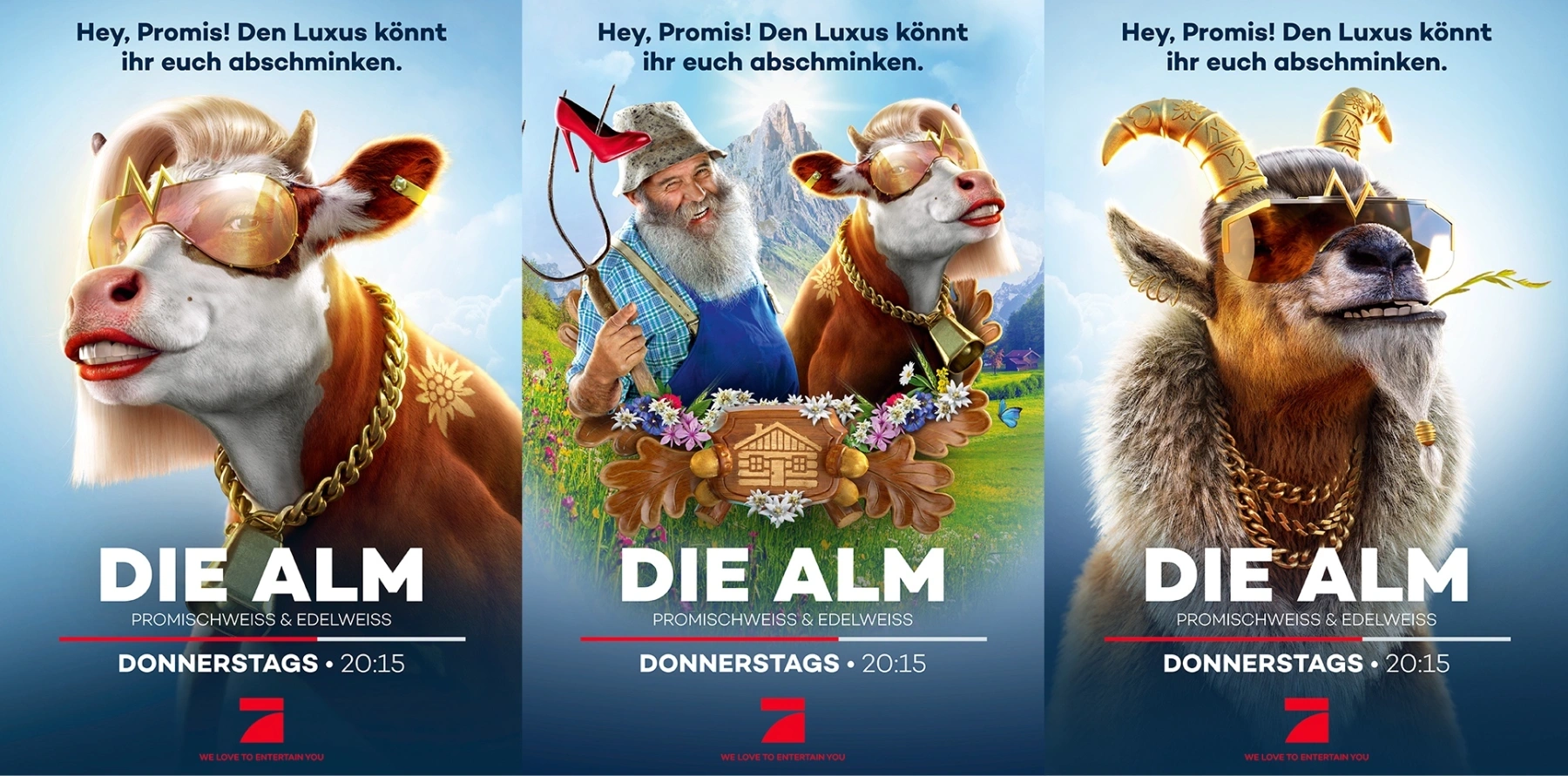 Seit dem 24. Juni läuten auf ProSieben die Kuhglocken, in der dritten Staffel von „Die Alm – Promischweiß und Edelweiß“. Auf einer Alm in Südtirol leben zehn Prominente in 1.680 Metern Höhe wie vor 100 Jahren: ohne Strom, ohne Heizung, ohne Luxus, unter 24-stündiger Beobachtung von Kameras. Eine Herausforderung nicht nur für die Promis, sondern auch für die Kreativen von Seven.One Creation, der Hausagentur von ProSiebenSat.1, die in ihrer Kommunikation für das TV-Format genau diese Kernbotschaft platzieren: