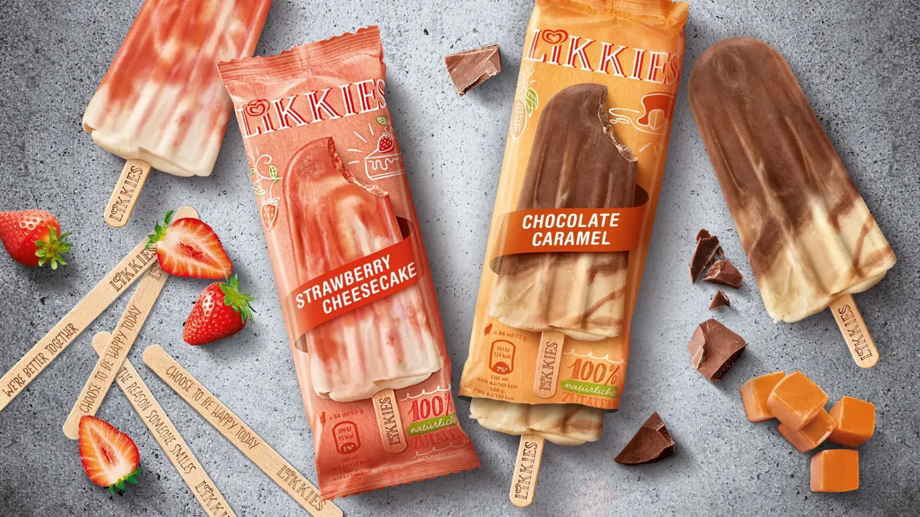 Abgeleitet von dem englischen Wort lick kreierte Hajok den Markennamen Likkies. In weißer Typografie mit rotem Schatten weckt das Logo gleich die Assoziation mit Langnese. Das Packaging Design unterstützt mit Illustrationen, Zierelementen und den handgeschriebenen Schriftarten den lebendigen und lockeren Homemade-Charakter der Eismarke. „Zum Anbeißen lecker“ lautet die Devise bei der Produktabbildung. Besonders beim Keyvisual auf der Rückseite lassen die in Sahne getauchten frischen Erdbeeren einem das Wasser im Munde zusammenlaufen.