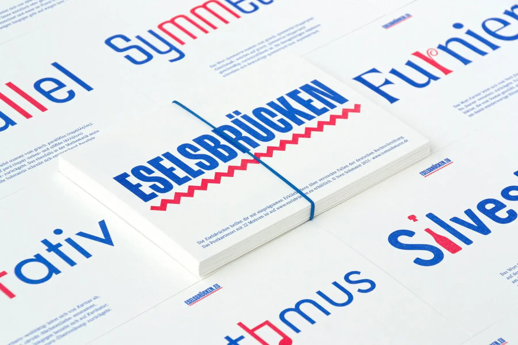 Das »Eselsbrücken«-Postkartenset mit 22 verschiedenen Motiven ist via www.eselsbrücken.eu erhältlich. Gedruckt im ökologischen Riso-Verfahren, verpackt in vegan verklebten Recycling-Kartons und natürlich 100 % made in Berlin. Ebenfalls im Shop: das zertifiziert klimaneutrale und mit Bio-Farben auf Recycling-Papier gedruckte »Eselsbrücken«-Plakat.