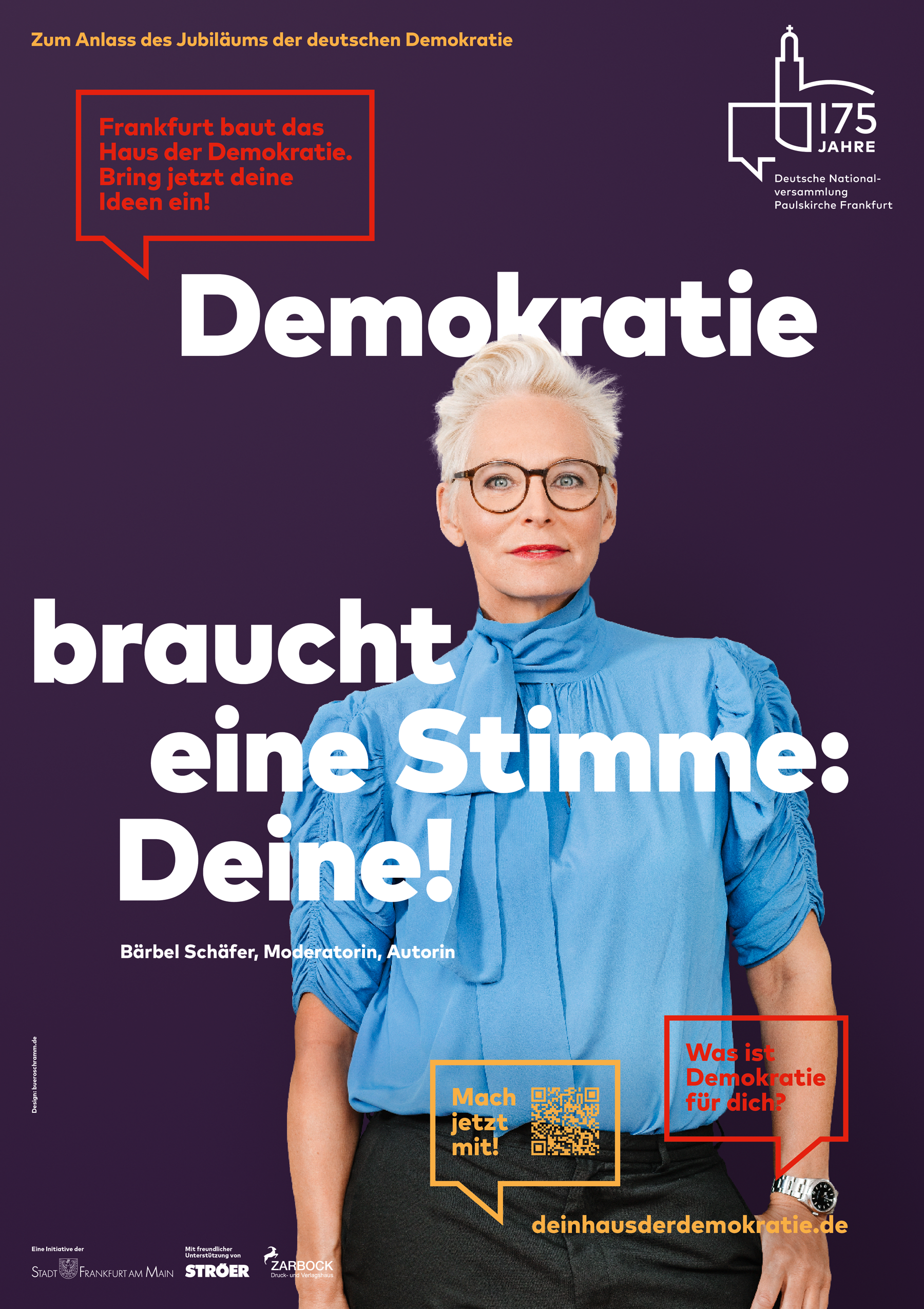 Im 175-Jahre-Logo fusionieren die Paulskirche und die Sprechblase als Symbol für demokratischen Austausch. In der Kampagne zur Bürgerbeteiligung fordern prominente Frankfurter*innen dazu auf, sich an der Umfrage zu beteiligen. Parallel dazu erzählen Menschen von nebenan, was Demokratie für sie bedeutet. Logo, Idee, Motto, Design sowie alle Kommunikations-Maßnahmen und Fotoshootings stammen von Büro Schramm für Gestaltung.