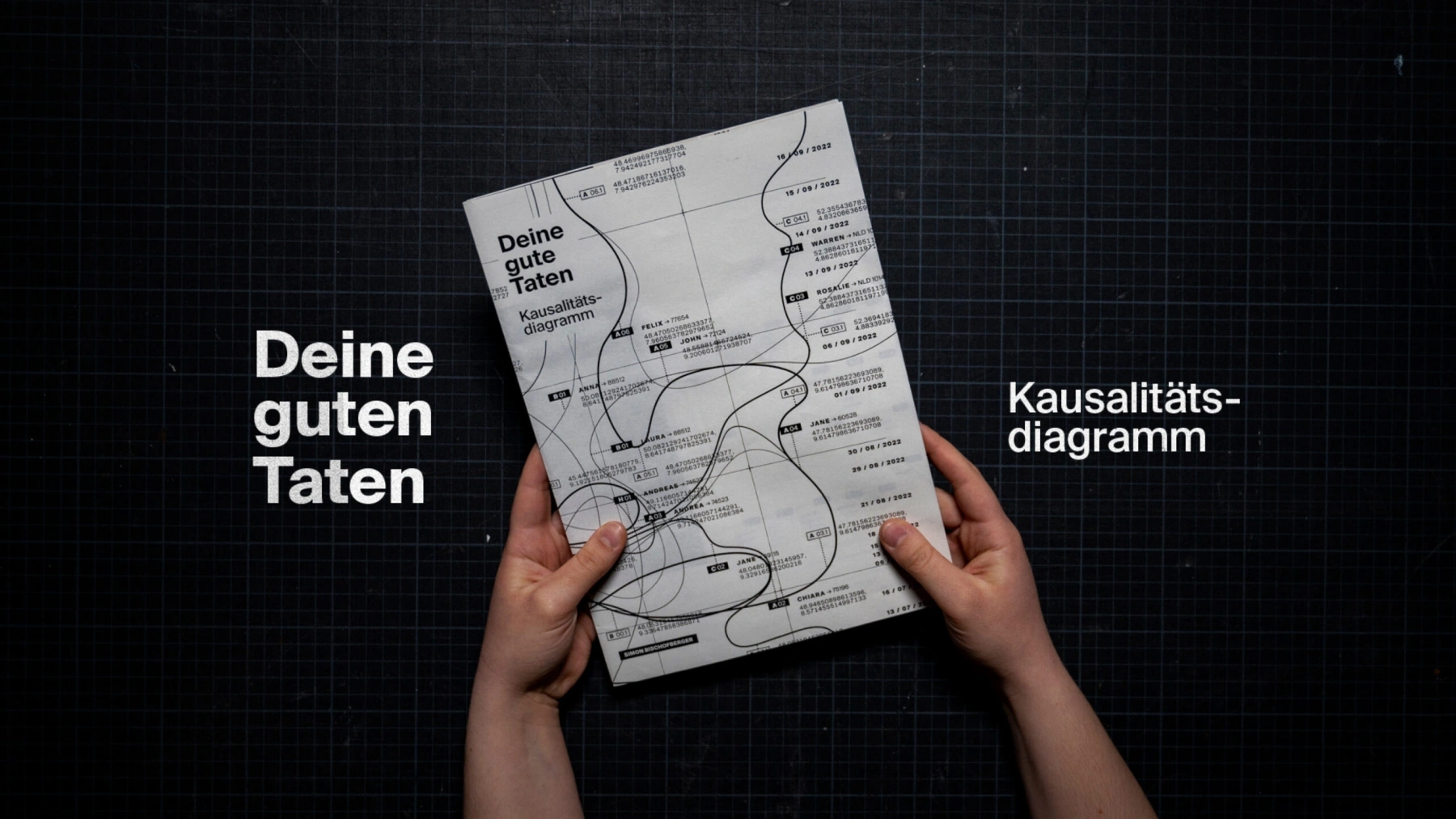 Das Medium der Arbeit ist eine Broschüre, deren Schutzhülle eine Karte mit Daten ist. Die Broschüre lässt sich aufklappen, um das Kausalitätsdiagramm und die Geschichten dahinter zu erforschen, sodass die Leser die Zusammenhänge nachvollziehen und die Auswirkungen einer einzigen guten Tat im Laufe der Zeit sehen können. Das Design der Broschüre ist eine einzigartige Mischung aus Datenvisualisierung und Storytelling.