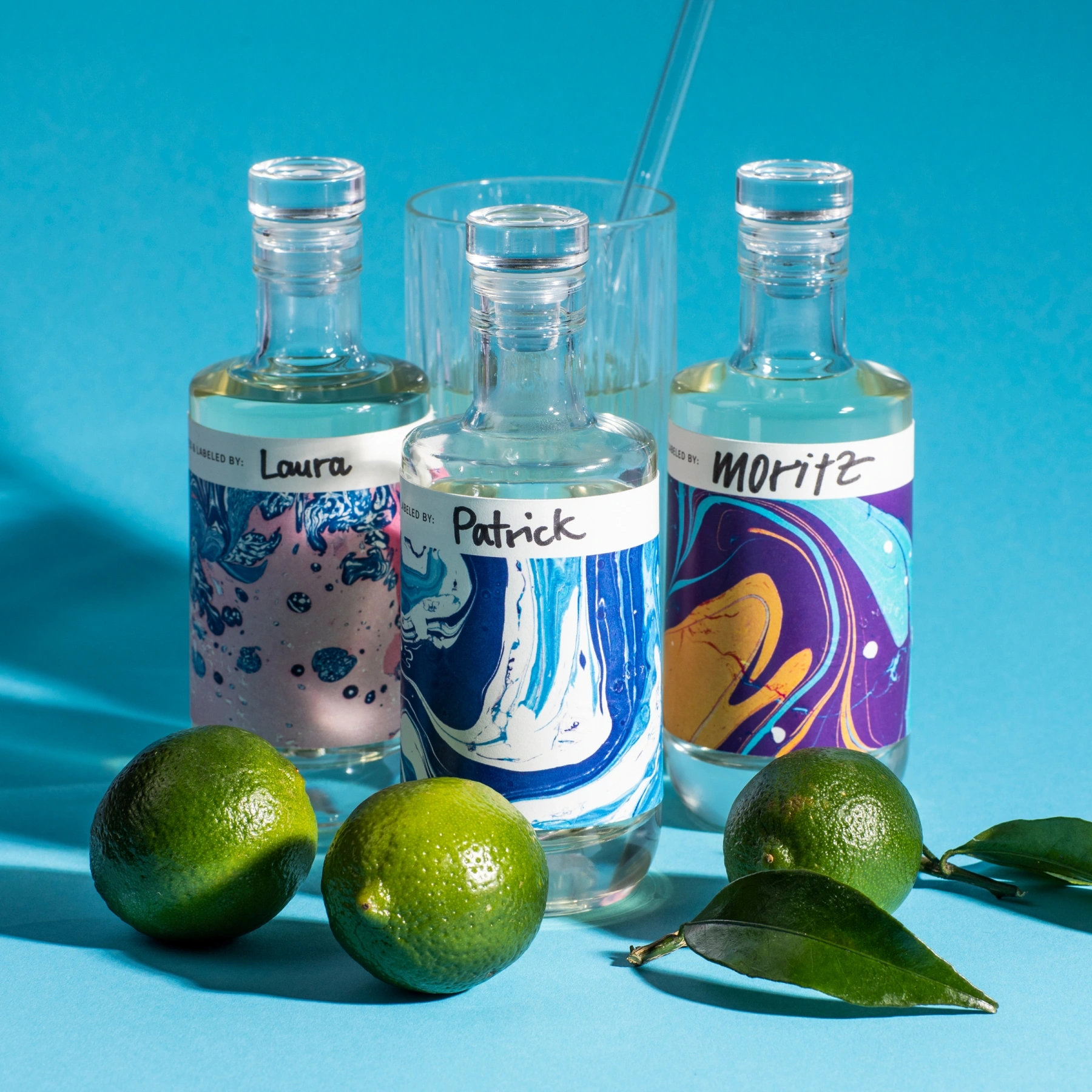 Auch wenn dieser immer gleich schmeckt, sollte er Vielfalt ausdrücken. Die Idee: ein standortübergreifender Workshop, in dem alle Kolleg:innen ihr persönliches Etikett gestalten. Die traditionelle japanische Maltechnik Suminagashi ist dabei nicht nur das stilistisch verbindende Thema, sie ist auch leicht zu erlernen, sehr variabel und liefert beeindruckende Ergebnisse: Durch das Auftropfen von Tinte auf Wasser entstehen marmorierte Oberflächen. Ein Prozess, der Neugier erfordert – für den es aber egal ist, ob man Designer, Stratege oder Praktikant ist. Die fertigen Ergebnisse wurden digitalisiert und nach dem Zufallsprinzip appliziert. On demand produziert für besondere Events, als Giveaway oder Sammlerstück. Und wie der Drink schmeckt? Nach Gin, Limette, Heu, Lavendel, Traube und Tee. Cheers!