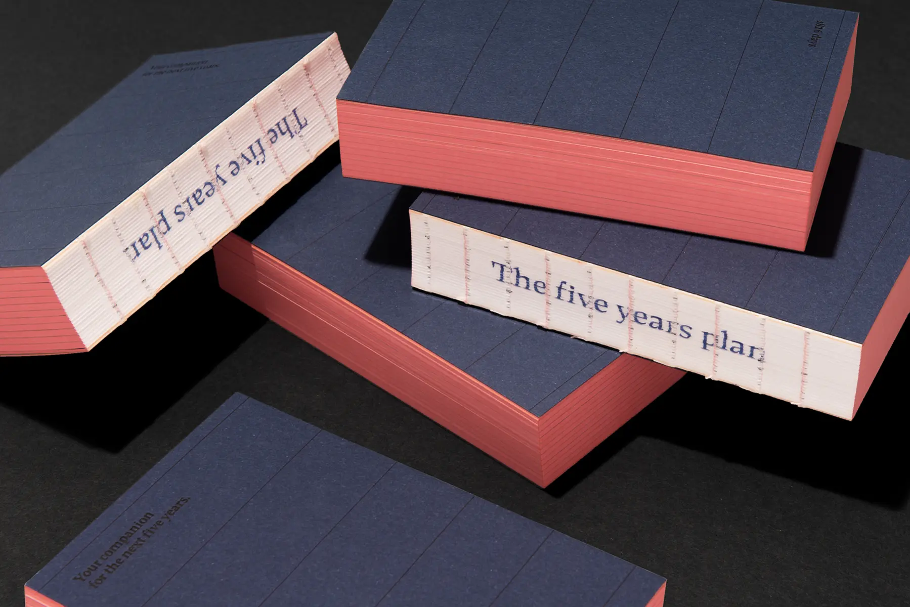 5 Jahre sind 1826 Tage – der Planer lädt dazu ein Gedanken, Erlebnisse und Pläne zu dokumentieren. Die Gestaltung basiert auf einem Raster mit 5 Zeilen für 5 Jahre. Die vertikale Unterteilung steht für die 12 Monate, so dass sich ein Raster ergibt, das die Gestaltung prägt: Die Zahlen auf den Monatstrennseiten entspringen diesem Raster und unterstützen die Orientierung.