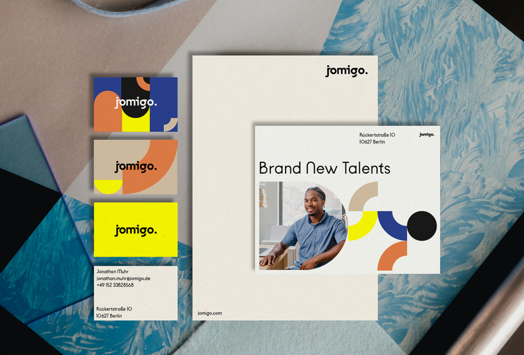 Für Jomigo entwickelte ich die neue Corporate Identity mit einem modularen Keyvisual. Sattes und leuchtendes Gelb und dazu Beigetöne unterstreichen die Botschaften genauso wie die lebendigen Fotowelten, die Recruiter und ihre Kunden zeigt. Ein frischer, knalliger Auftritt für eine junge Agentur.