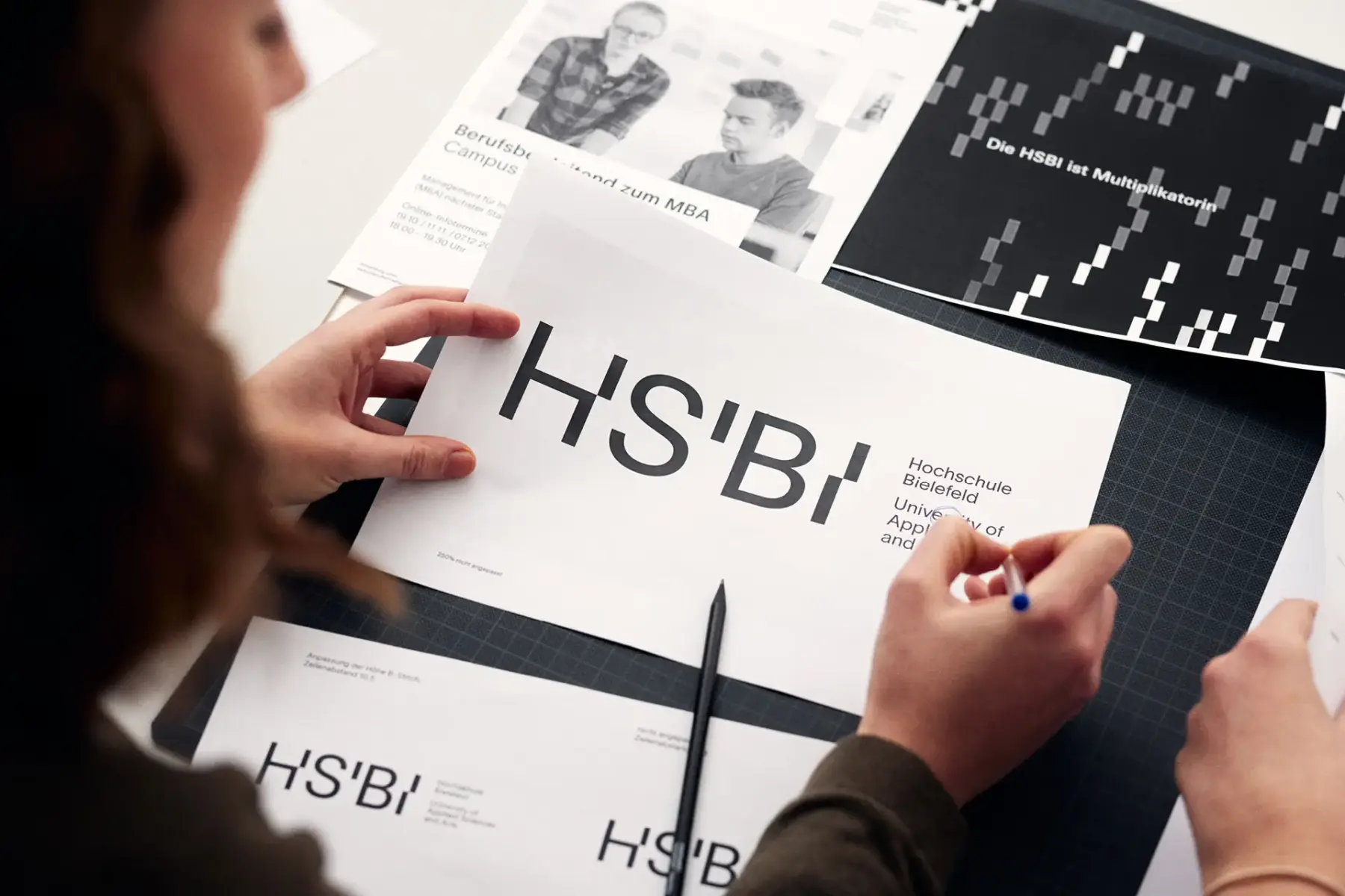 Das Signet, das aus einer markanten Wortmarke besteht, arbeitet mit der Abkürzung HSBI (Hochschule Bielefeld) und schafft durch seine klare, zeitlose Ästhetik einen hohen Wiedererkennungswert. Die Dachmarke besteht aus der Wortmarke HSBI und dem namentlichen Zusatz „Hochschule Bielefeld – University of Applied Sciences and Arts“. Die Fachbereiche, Dezernate und Projekte werden im Versatz typografisch dazu angeordnet.