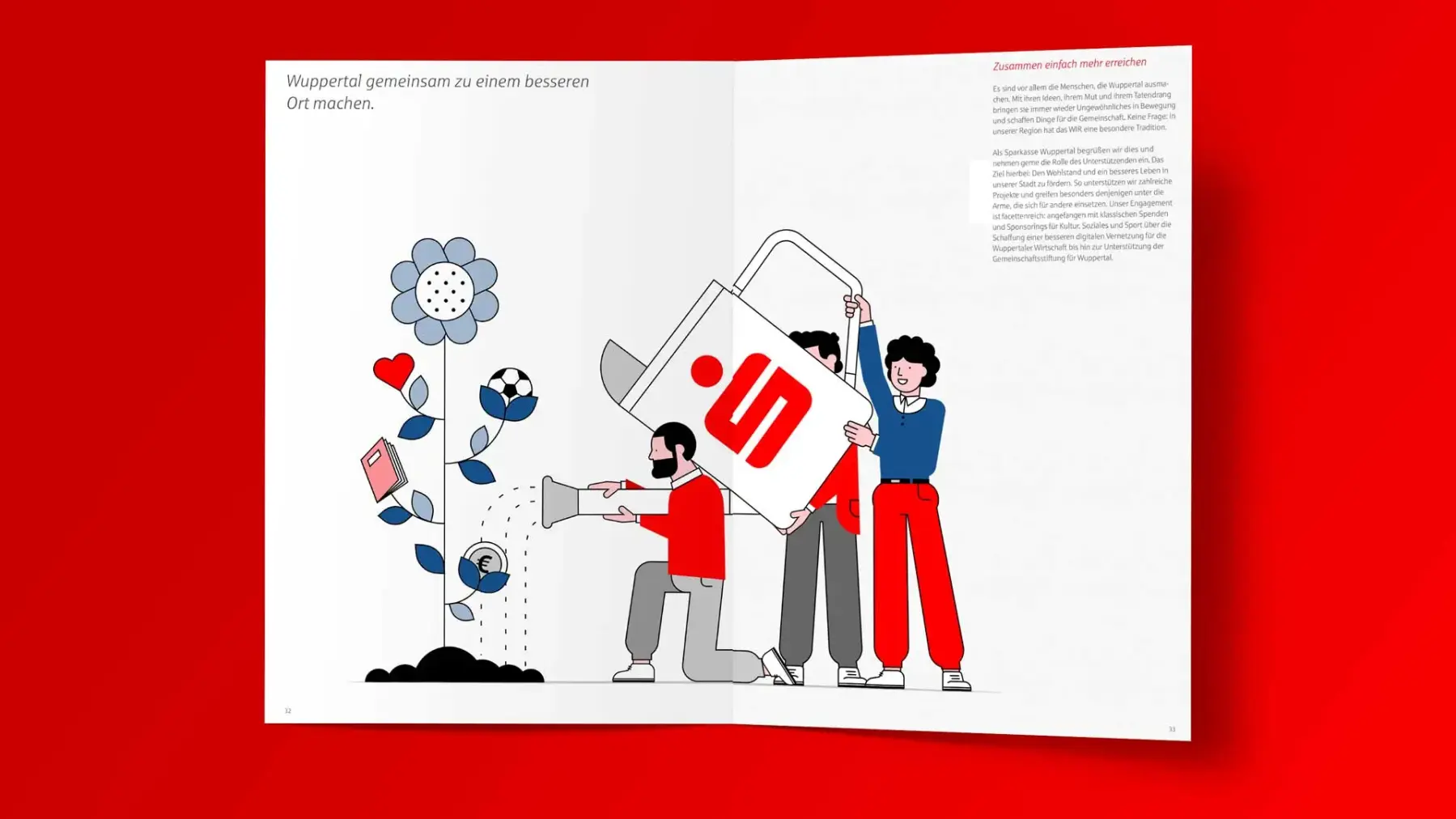 Für den Jahresbericht 2022 der Sparkasse Wuppertal entwickelten wir einen modularen Illustrationsstil nach Corporate Design Vorgaben. Die Herausforderung war es den Illustrationsstil so zu konzipieren das er flexibel und ohne großen Aufwand bei der Sparkasse eingesetzt werden kann. Hierfür entstand ein kleiner Illustrations-Baukasten mit festen Motiven, losen Illustrationen sowie Piktogrammen für den internen Einsatz. Ein Bewegtbildkonzept für den Illustrationsstil ist auch angedacht.