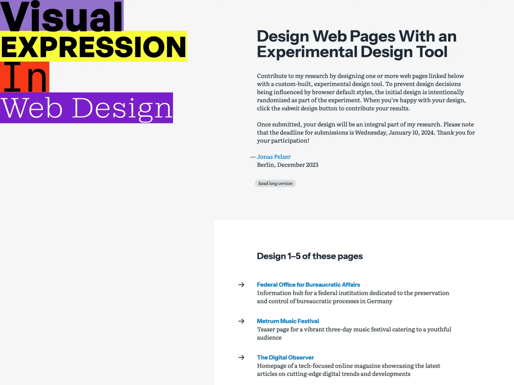 To gain further insights, I created five single-page websites on different topics with fictitious content that can be designed with the tool on a desktop computer. To avoid design decisions being influenced by browser default styles, the design parameters are randomized at the beginning. Your contribution to designing one or more of these pages would be invaluable to my research. Results will be documented by clicking the submit design button at the end of your design process.