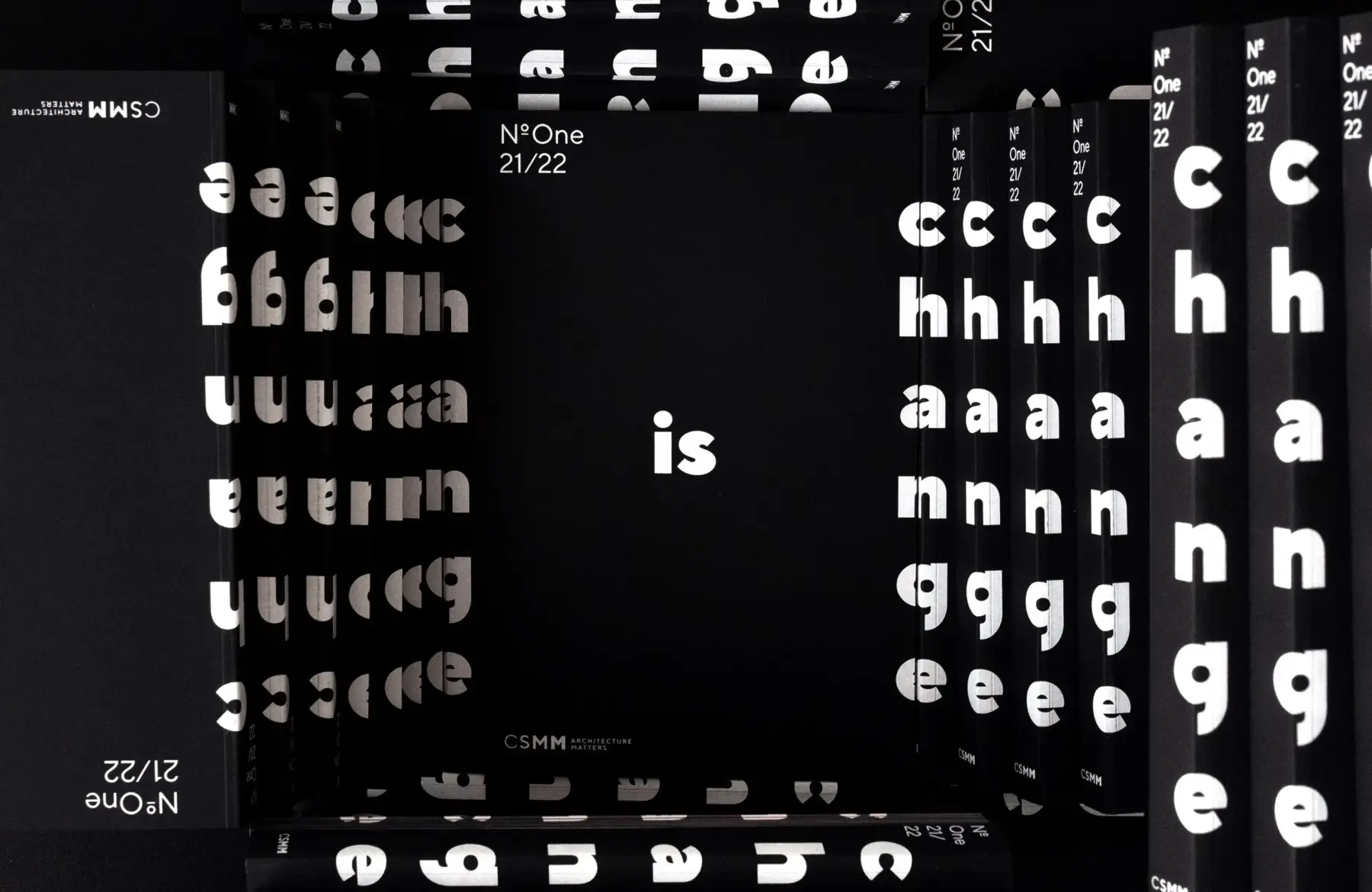 “Der Titel Change is Chance umklammert das Bookazine nicht nur inhaltlich, sondern auch visuell” so Carmen Vierbacher, Head of Communication Design bei CSMM. Die einzelnen Wörter des Schriftzugs sind über den Buchrücken, die Vorderseite und den Seiten-Schnitt gedruckt. Teile des Typogramms sind so nur aus bestimmten Perspektiven lesbar und der Betrachter wird ermutigt, seine Sichtweise zu ändern und tatsächlich “ums Eck” zu denken. Dies ist mehr als eine typografische Spielerei, denn es schafft eine optische Dreidimensionalität und greift so den architektonischen Kontext auf.