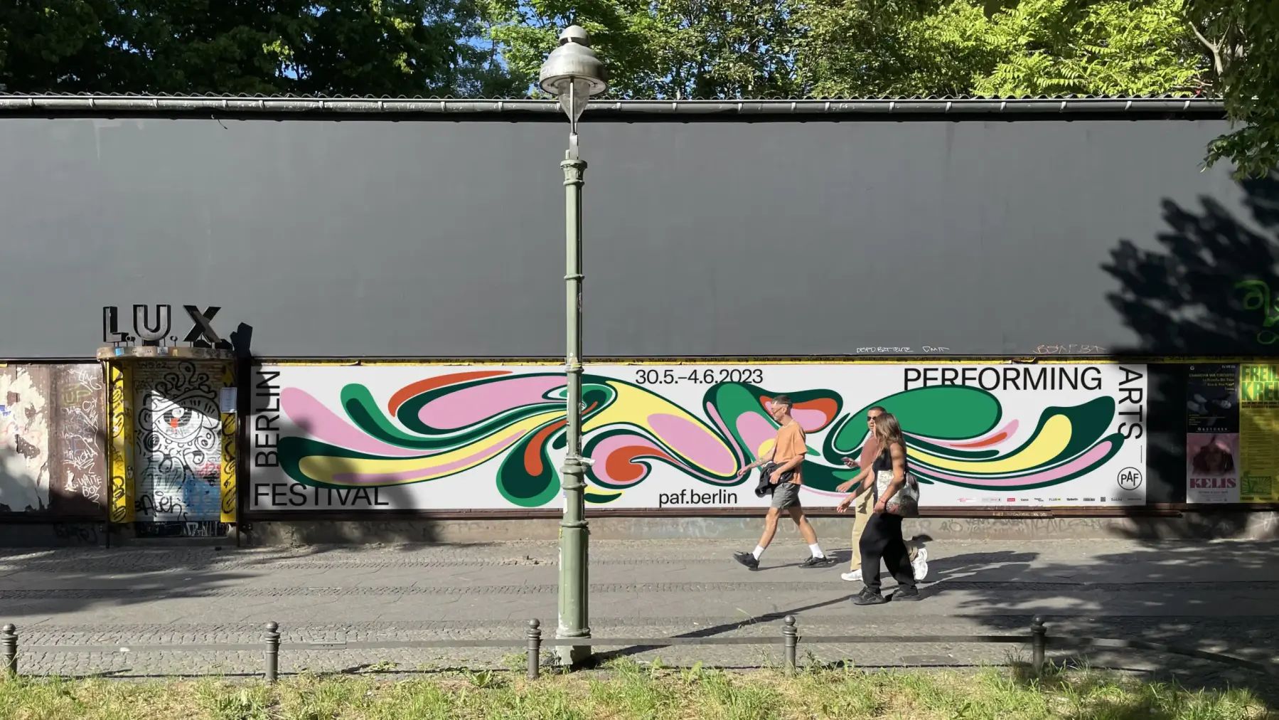 Viele viele bunte Farben. Ein buntes und vielfältiges Festival sollte auch genau so auftreten: Bunt, vielfältig, immer anders. Das Besondere an darstellenden Künsten ist ihr zeitweiliger Charakter. Sie sind mehr ein Erlebnis als ein Artefakt. Mit dieser Idee im Hinterkopf entwickelten wir ein grafisches Konzept, das beweglich ist. In Form von fluiden Objekten, die voller Energie und immer in Bewegung sind.