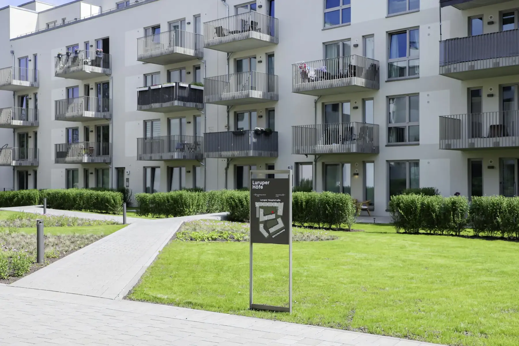 Städtisch und dennoch grün: die Luruper Höfe liegen zwischen zwei Hauptstraßen und stehen für Verbindung. Das Wohnquartier vermittelt naturnah, auch durch seine Signaletik, Wohlfühlatmosphäre, hohe Lebensqualität und lädt zum Flanieren ein.