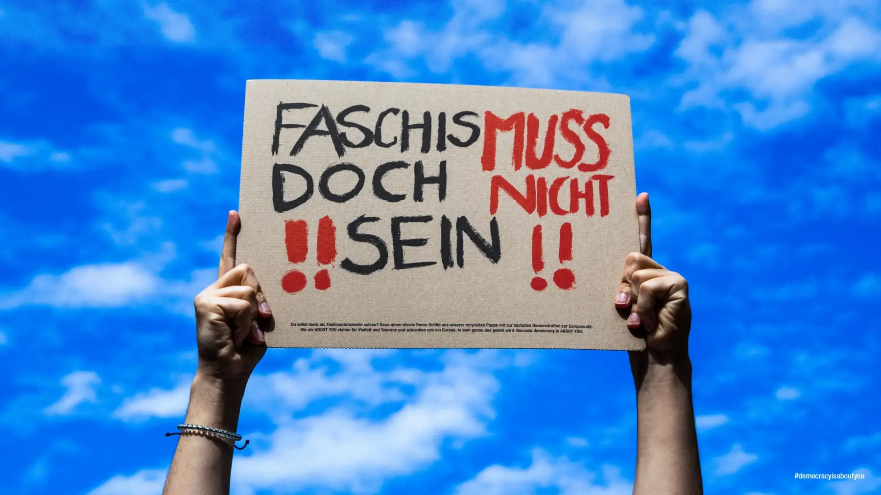 Seit dem 22. Mai liefert About You seinen Kund:innen fertige Demonstrationsschilder direkt nach Hause: Sie sind Teil der Lieferkartons, die About You verwendet. Die Schilder sind kreativ gestaltet und mit kraftvollen Slogans versehen, um bei Demonstrationen und öffentlichen Veranstaltungen ein Zeichen für Demokratie und Vielfalt zu setzen. Dies ermöglicht den Kund:innen, ihre Unterstützung für diese wichtigen Werte einfach und effektiv auszudrücken.