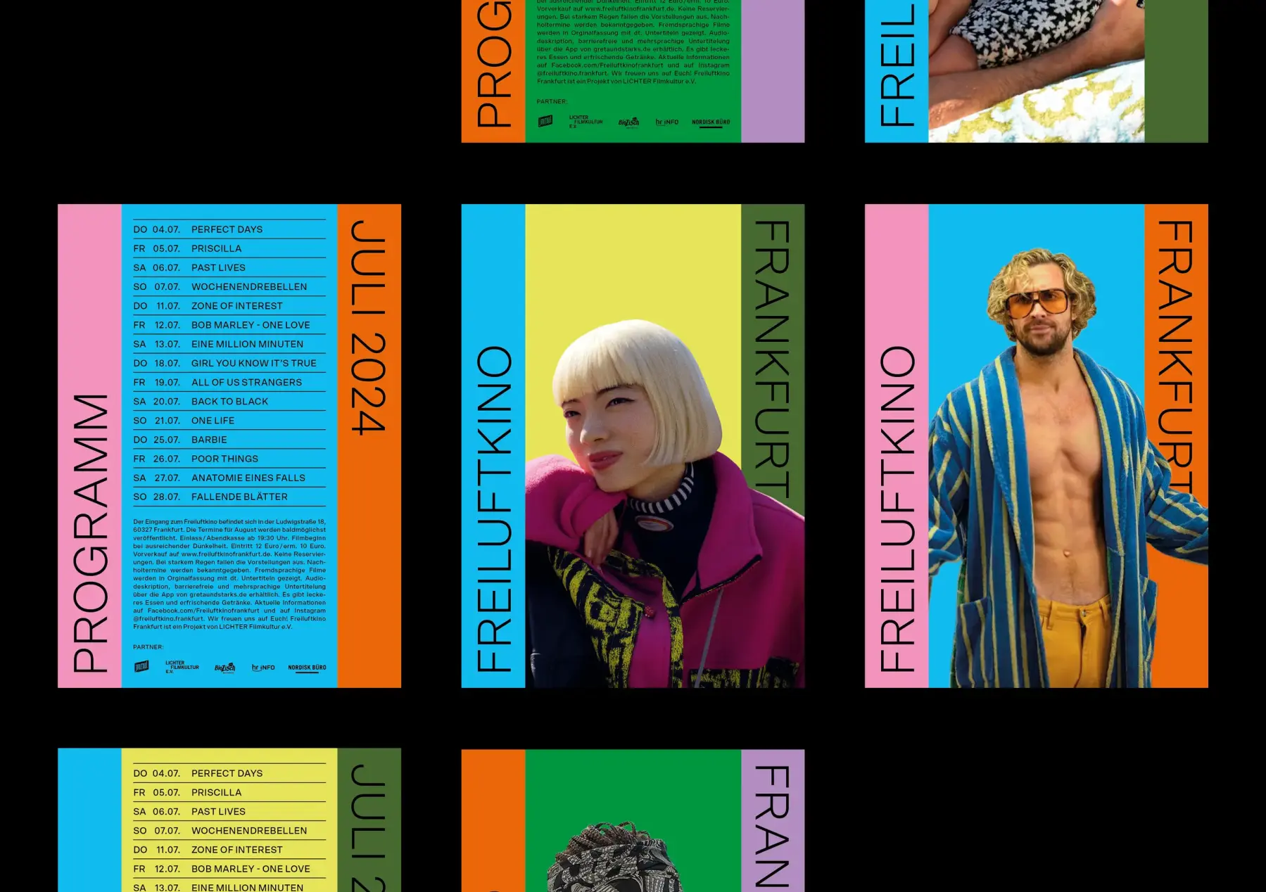In der Saison 2024 erstrahlt die Kampagne für das Freiluftkino Frankfurt wieder in heiteren Sommerfarben. In Kombination mit Filmstills aus dem aktuellen Programm machen die Plakate Lust auf laue Sommerabende im Freiluftkino.