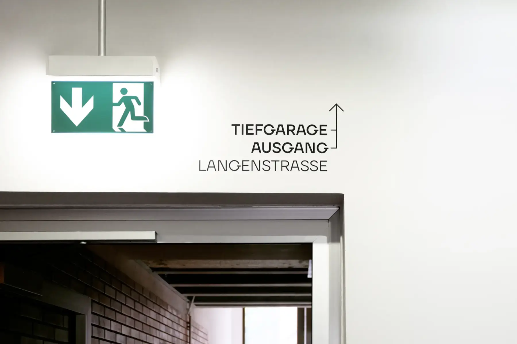Hier kommt Studio Gourdins Leitsystem-Design ins Spiel. Wir haben ein Konzept entwickelt, das nicht nur funktional, sondern auch ästhetisch überzeugend ist und sich nahtlos in die Architektur des Gebäudes einfügt. Besonders prägnant sind die Etagenübersichten, die als große Wandgrafiken in der Nähe der Fahrstühle Platz finden. Diese übersichtlichen Darstellungen werden durch runde Tafeln ergänzt, die weitere Informationen in einem klaren und leicht verständlichen Format bieten.