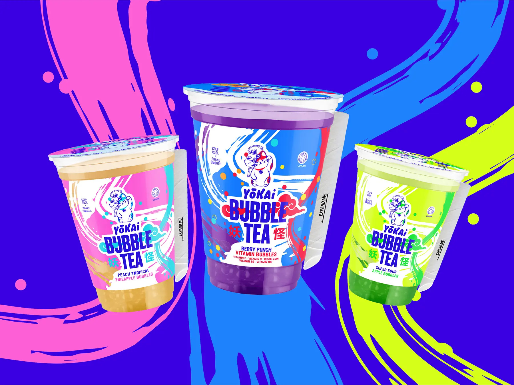 Für Yokai Bubble Tea übernahm Heynink die ganzheitliche Entwicklung des Markenauftritts, von Branding über Verpackungsdesign bis hin zu Print- und Webdesign. Ziel war es, eine unverwechselbare Marke zu schaffen, die durch leuchtende, dynamische Farben und verspielte Illustrationen besonders die junge, trendbewusste Zielgruppe anspricht.