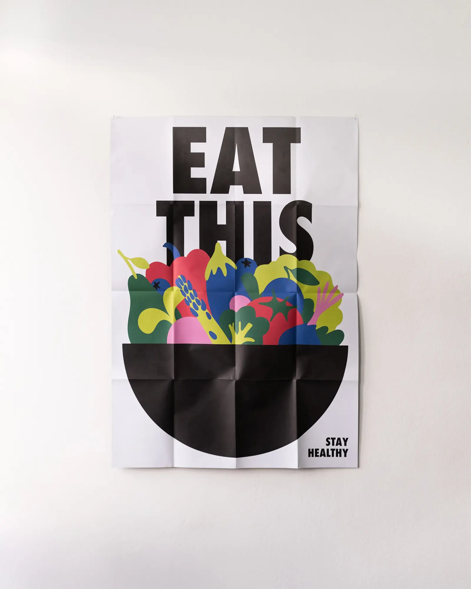 Eat This, Stay Healthy – mit unserem farbenfrohen, faltbaren Wandkalender, der auch als Poster verwendet werden kann. Der Kalender enthält bunte Illustrationen und eine Auflistung von saisonalen Obst- und Gemüsesorten für jeden Monat. Und wenn man einen „Tapetenwechsel“ braucht, dann dreht man das Poster einfach um. Denn auf der anderen Seite befindet sich eine plakative Illustration und das „Eat This – Stay Healthy“-Statement.
