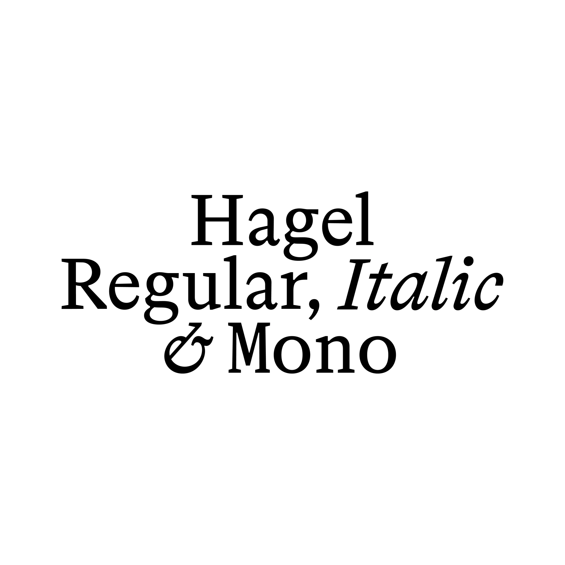 Hagel is a contemporary serif typeface designed for continuous reading and typographic clarity. Originally conceived as a text face, it reveals subtle tension and sharp detailing at larger sizes, making it equally suited for editorial use and expressive display typography. The typeface balances structure and nuance, aiming for a rhythm that feels both deliberate and open. Hagel is currently available in Regular, Italic, and Mono styles, with further extensions in development.
