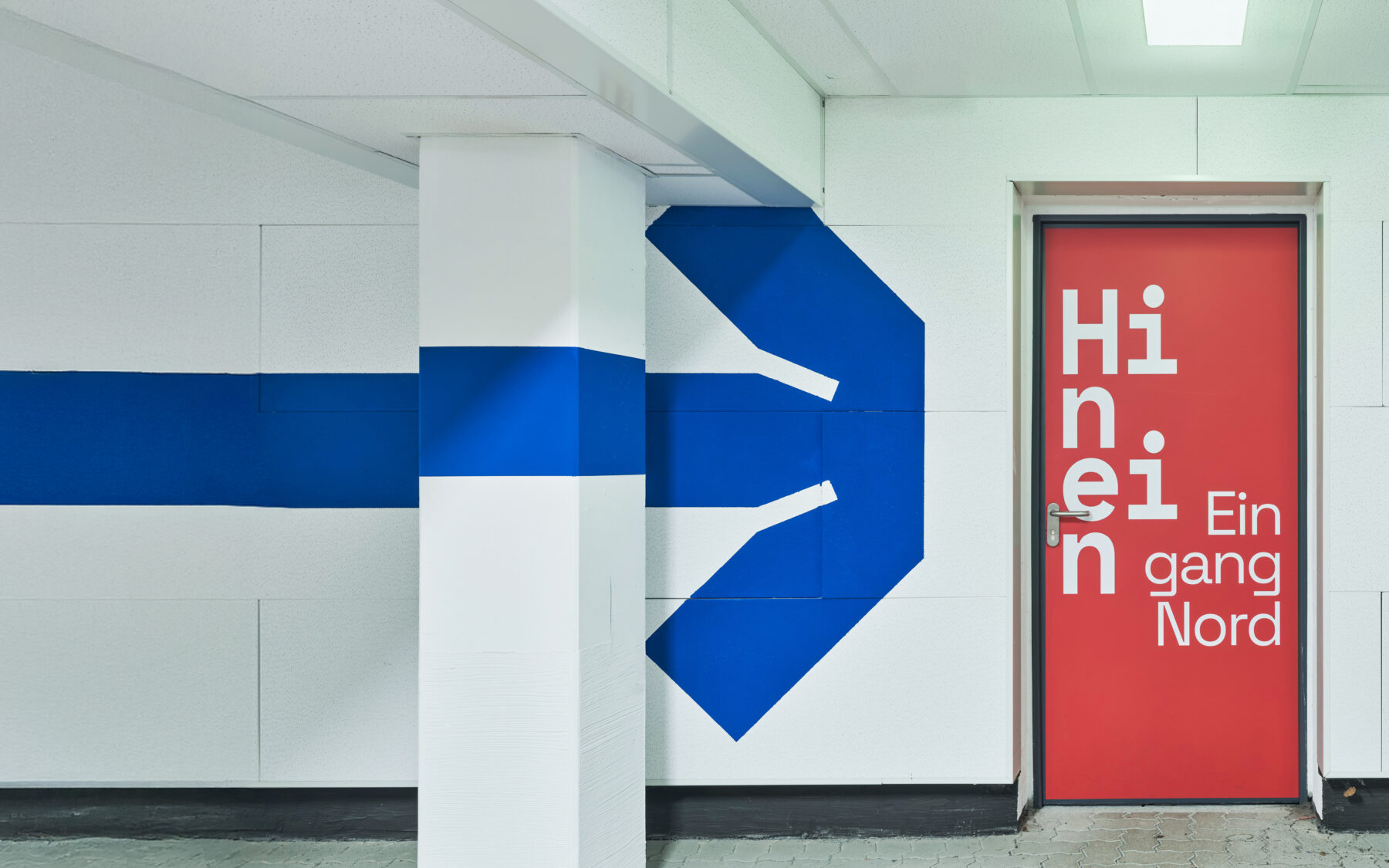 Die beiden CD-Farben Rot und Blau dienen als Basisfarben für die reine Informationsebene, an Eingängen ruft das massiv eingesetzte Rot: „Komm zur mir!“ Für ein intuitives Orientieren gibt es pro Ebene eine weitere Farbe und ein Muster, zu finden in der Glasfolierung und an den Wänden. Humorvolle Gestaltung mit Liebe fürs Detail. So kann Schule Spaß machen!