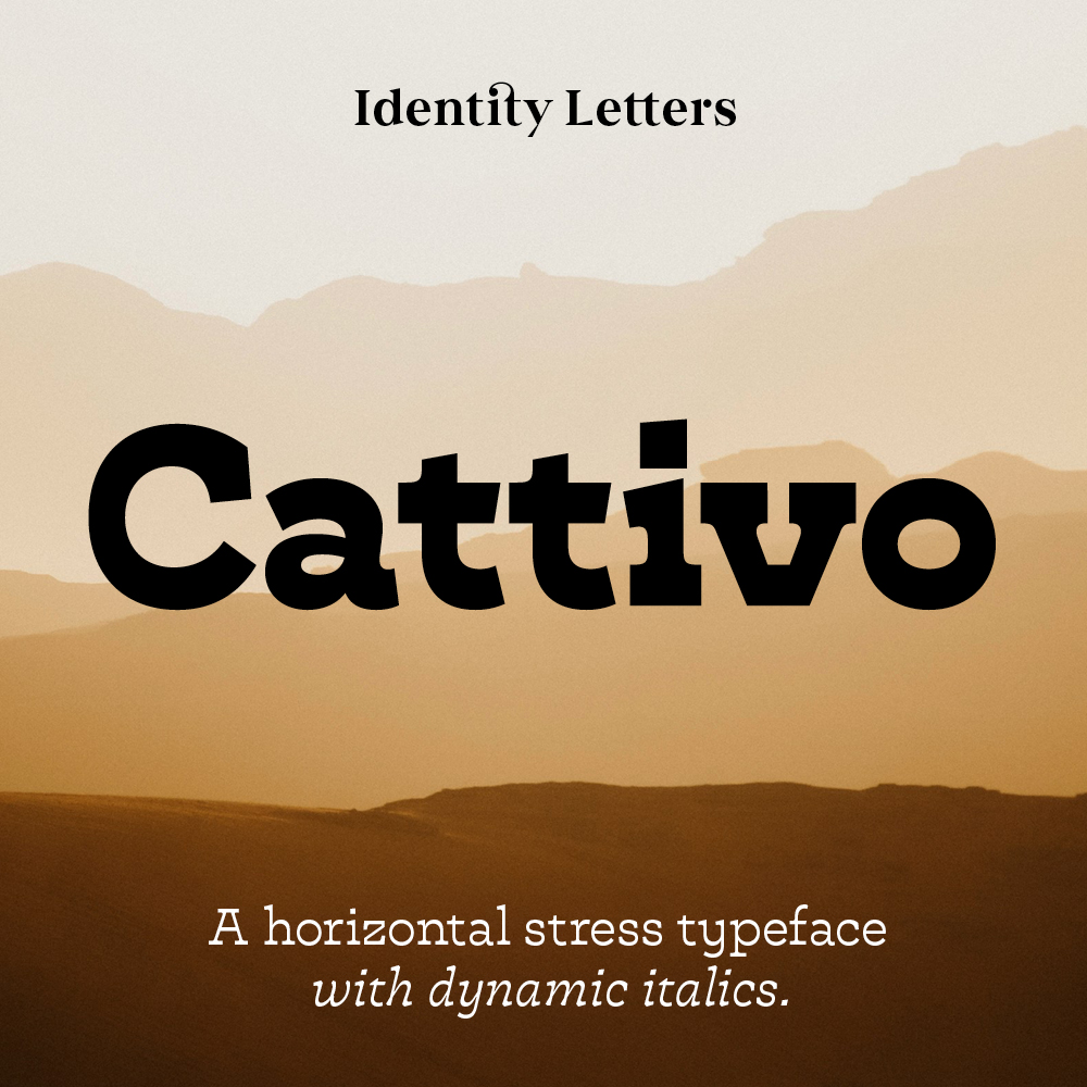Cattivo is a frontier-proof slab-serif typeface that feels at home in your favorite Spaghetti Western. With horizontal stress, sleek curves, and contemporary proportions, it is a tongue-in-cheek reinterpretation of the Italienne genre. Reduced contrast and advanced typographic features make it suitable for both display use and short segments of body text.