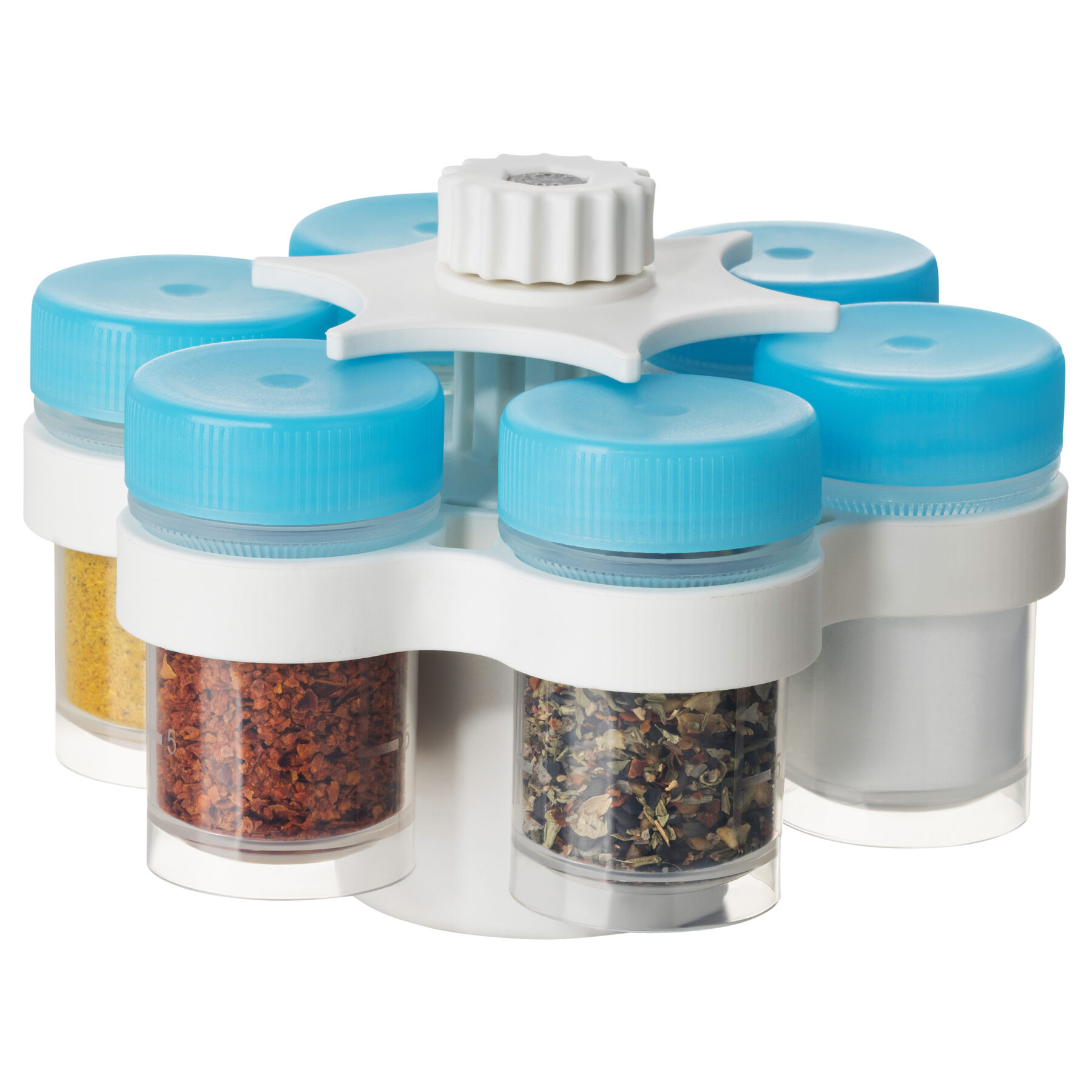 Der Kontrast zwischen dem Weißen Träger, Zentralbehälter und Verrieglung und den türkisfarbenen Deckel ist als Anspielung auf die Farbenpracht der Natur zu verstehen, ohne zu ausdringlich zu wirken. Die Behälter sind transparent ausgeführt. Was zum einem den praktischen Hintergrund hat, dass leicht zu erkennen ist, welches Gewürz sich im jeweiligen Behälter befinden, zum anderen stellen die Farben der unterschiedlichen Gewürze ein Teil des Design da.