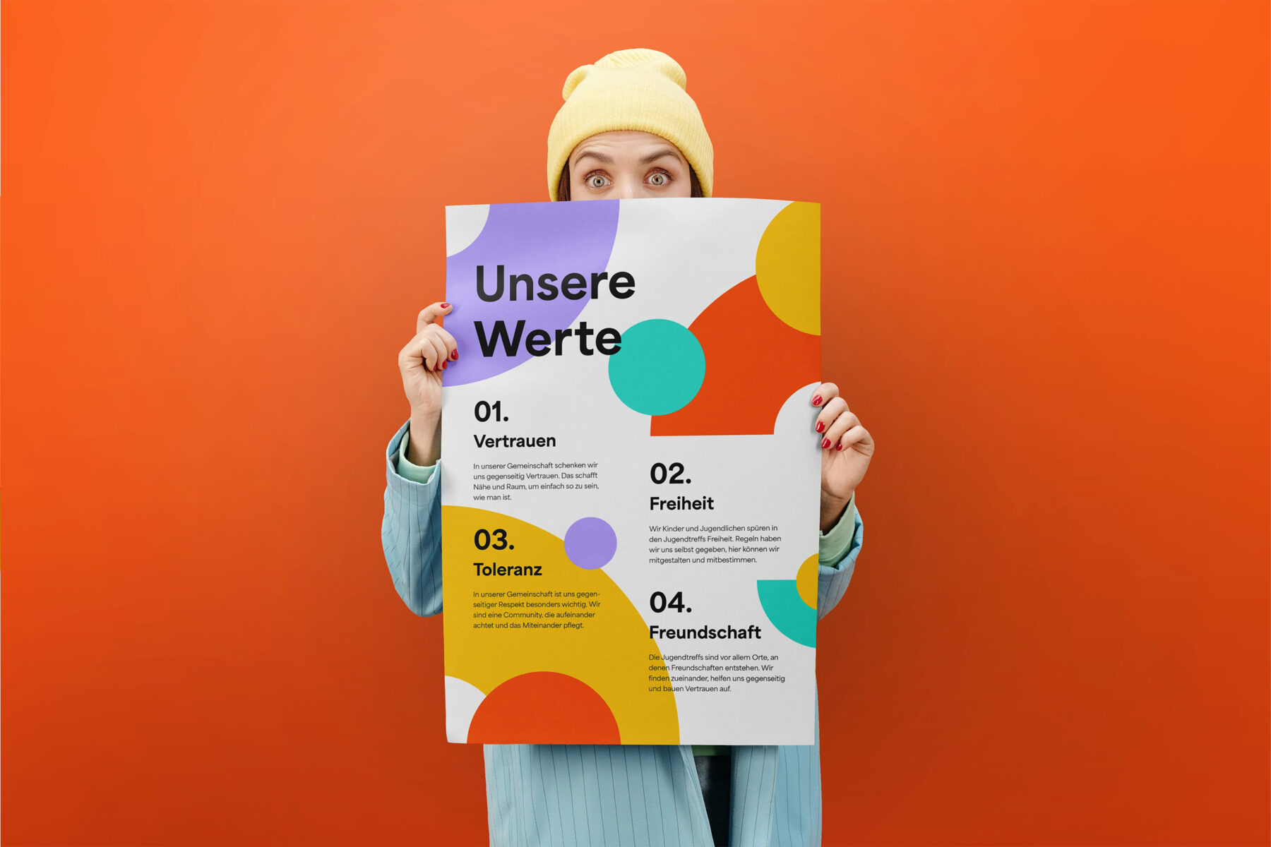 Das Ergebnis ist eine lebendige visuelle Identität, die Vielfalt und Gemeinschaft gleichermaßen sichtbar macht. Kreisförmige Gestaltungselemente symbolisieren Zusammenhalt und Begegnung, während eine farbige Palette aus „Happy Yellow“, „Unique Mint“, „Bold Orange“ und „Creative Lilac“ Energie und Individualität transportiert. Der Claim Ich.Wir.Gemeinsam. verdichtet die Idee des Projekts zu einer klaren Botschaft.