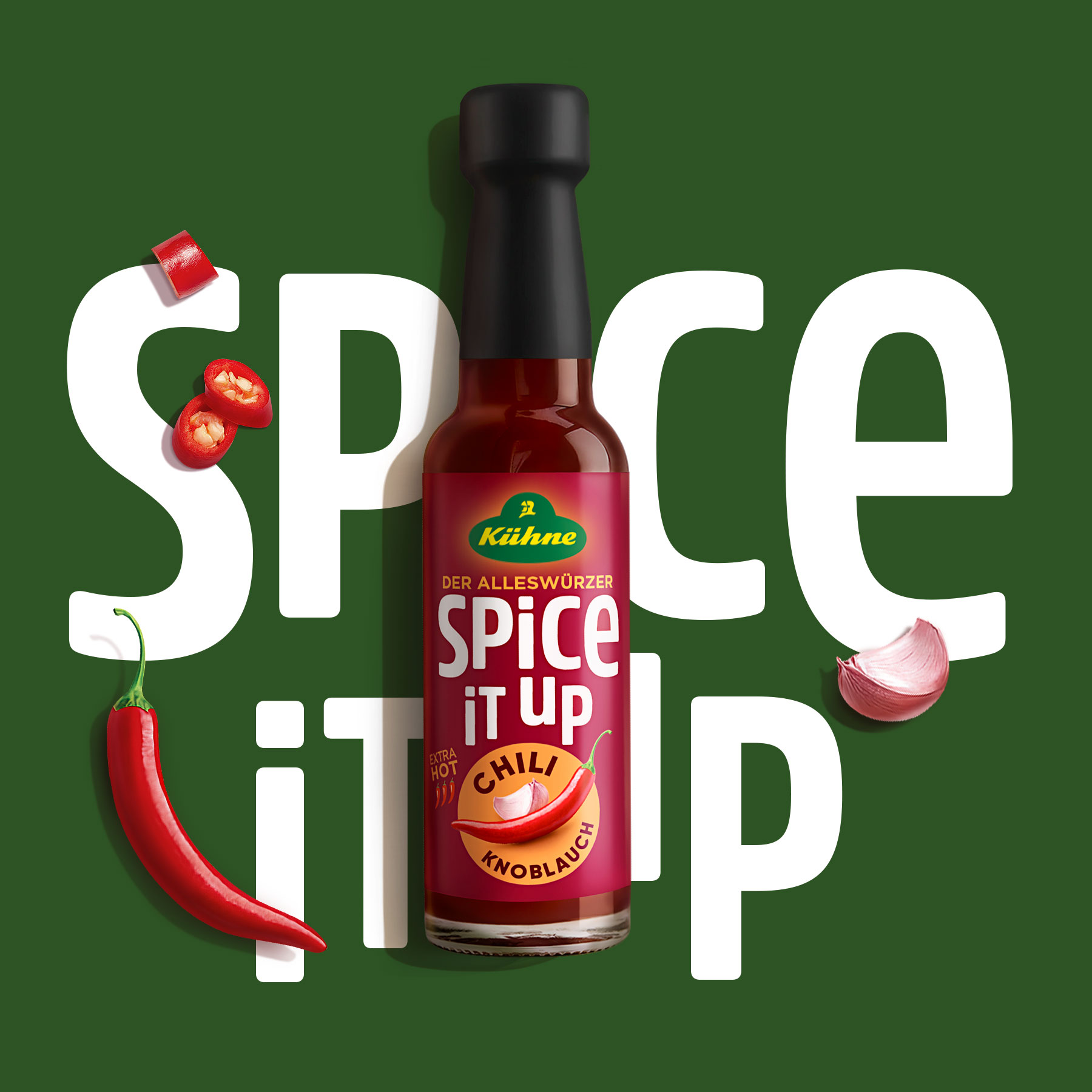 Die kleinen Würzflaschen von Kühne machen ihrem Namen alle Ehre und verleihen jedem Gericht den Kick und damit einen echten Lecker-Moment! Spice it up ist ein Geschmacksbooster, der ganz ohne künstliche Zusätze auskommt. Die zwei verschiedenen Sorten – Chili Knoblauch und Mediterrane Kräuter – eignen sich ideal zum Kochen und Nachwürzen und daher sollte das Packaging Design besonders eines sein: tasty!