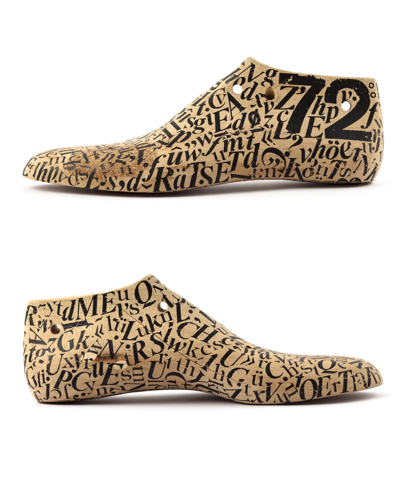Als Auftakt einer Serie von Holzobjekten mit Schrift sind diese individuellen Schusterleisten entstanden. Bei den Arbeiten handelt es sich durchweg um Alltagsgegenstände aus dem handwerklichen Bereich, die erst durch Schrift zum Designobjekt erhoben werden.