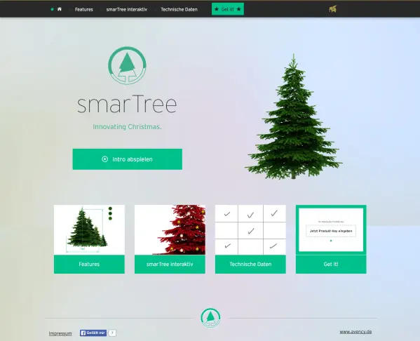 So verkauft man einen Weihnachtsbaum! Avency verspricht »Eine Koryphäe unter den Koniferen« mit »Großer Geschenkeablage«, das das Prädikat »Astrein« hat und »Gänsehaut-Feeling« bietet.