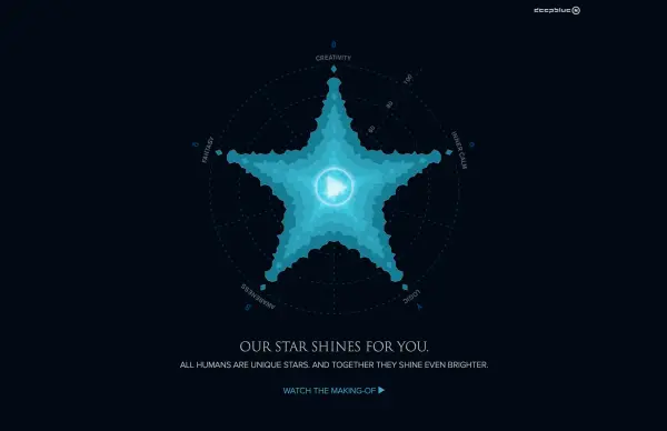 Deepblue holt für seine Weihnachtsgrüße weiter aus. Kern der Aktion ist die Idee, das jeder Mitarbeiter einzigartig ist. Um das zu beweisen werden die Augenbewegungen jedes Mitarbeiters getracked und in einem Stern abgebildet, so dass für jeden Mitarbeiter ein eigener Stern entsteht. Dazu gibt es auf der Seite ein Making-Of-Video, das die komplexe Idee erklärt.