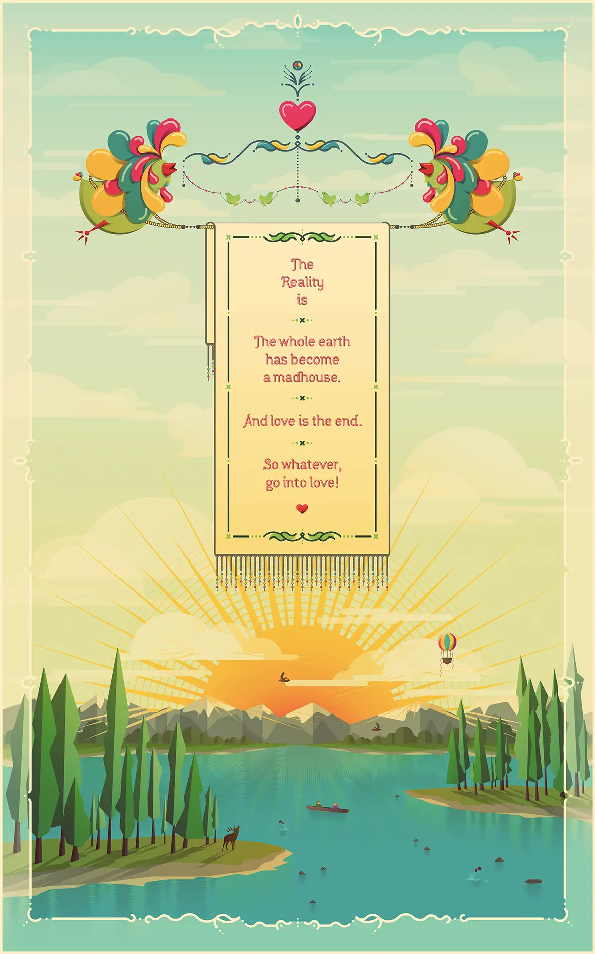 Das Bild (und auch die Aussage, die “verkündet” wird) soll durch die Farb- und Lichtstimmung eine angenehme Wirkung erzielen. Das Bild wurde in Illustrator erstellt und ausschliesslich harte Kanten verwendet, was beispielsweise beim Wasser eine Herausforderung darstellte.