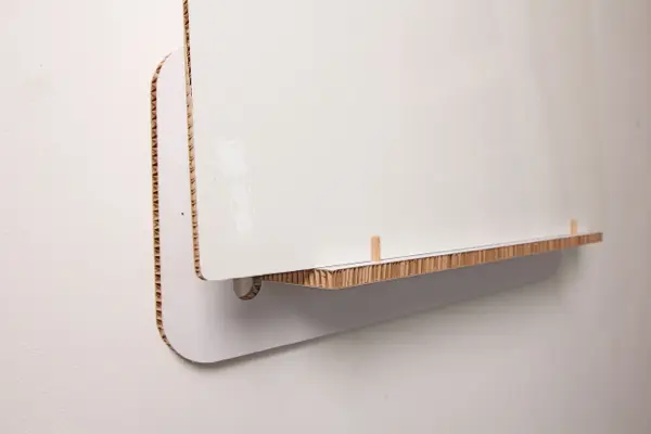 Als Weiterentwicklung des Whiteboards ist das Whiteboard von “Out of the Box” beidseitig beschichtet und besteht aus leichten Kartonplatten. Durch das geringe Gewicht lassen sich die Notizen oder noch leeren Whiteboards schnell in einen anderen Raum transportieren und einfach fixieren. Zudem kann man selbst bestimmen wie und wo man die “Disketten” des Whiteboards verwendet – ob stehend, flach auf dem Tisch oder doch klassisch an der Wand.