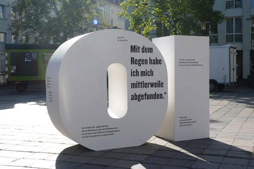 Diesen und vielen weiteren Fragen näherte sich ein Team aus Designern der Hochschule Niederrhein mit dem Ziel, die Öffentlichkeit für die Thematik zu sensibilisieren. Die Umsetzung, die schließlich in Krefelds Innenstadt zu sehen war, legte den Fokus auf Migration und Spracherwerb. Zwei Meter hohe, dreidimensionale typografische Wortgebilde fanden sich am Bahnhofsvorplatz, sowie vor dem Rathaus und der VHS. Sie sollten die Tatsache visualisieren, dass Sprache Barriere sein kann, oder aber Zugang. Dass sie Menschen teilhaben lassen kann, oder sie ausgrenzen. Und sie sollten die Passanten einladen, die Installation physisch zu erfahren, ganz ohne Berührungsängste.