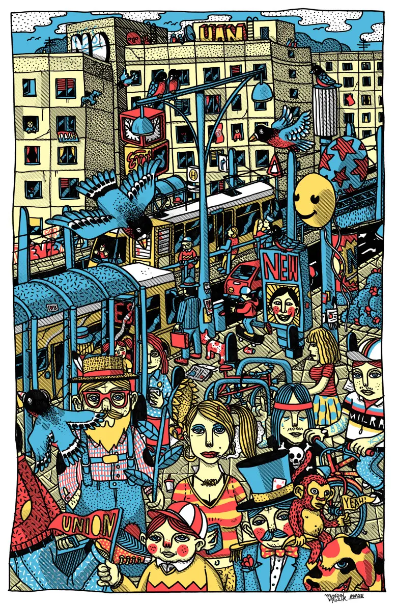 Hier habe ich eine Plakatreihe gemacht, inspiriert von dem immer reichlich bevölkerten und über die Stadtgrenzen hinaus bekannten Alexanderplatzes in Berlin. Die Illustrationen sind wie der Platz selbst auch mit Menschen, Dingen und Getier geflutet.