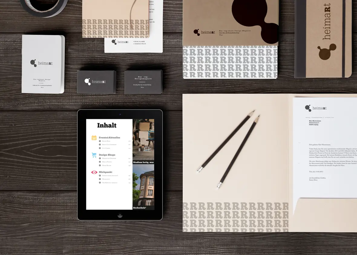 Within the framework of the Heimart project, I created the magazine, a corporate design and several print products such as business cards, letters and others. Furthermore I created several merchandise article to promote the magazine and spread the local awareness for design in general.
