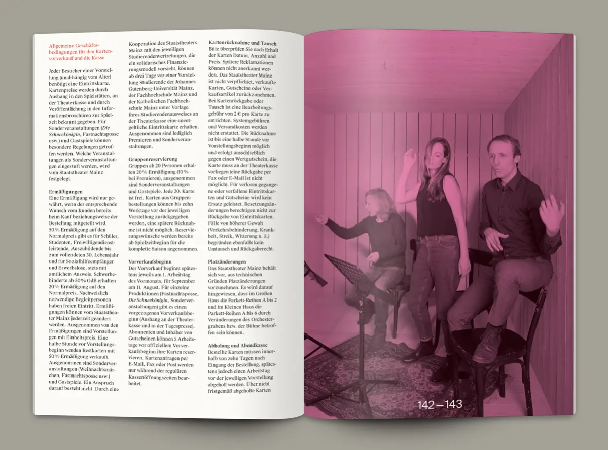 Als Auftakt eines neuen Erscheinungsbildes für das Staatstheater Mainz entwarfen die Designer Anna Bühler, Nina Odzinieks, Pit Stenkhoff und Ole Jenssen von Neue Gestaltung, Berlin ein neues Spielzeitheft für die Theatersaison 2014/15. Unter der Leitung des neuen Intendanten Markus Müller wird das Staatstheater ab dem Sommer 2014 ein neues und aufregendes Programm in den Sparten Schauspiel, Oper und Tanz präsentieren.
