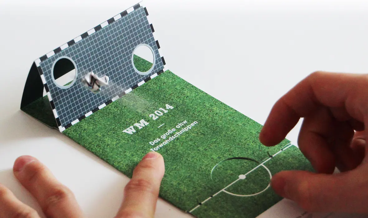 Aufgabe war es, nicht nur eine einfache Postkarte mit einem “schönen Design” zu entwickeln, sondern eine Grußkarte zu gestalten die den Nutzer zu einer Interaktion mit der Karte animiert und den Spieltrieb weckt. So entstand eine Klappkarte die als Torwand umfunktioniert werden kann. Durch das einscannen des QR-Codes auf der Rückseite der Karte und dem Einschieben des Smartphones in den dafür vorgesehenen Schlitz entsteht durch den extra aufgenommenen WM-Sound eine wahre Stadion-Atmosphäre und feuert den Nutzer an, Tore zu schnippen.