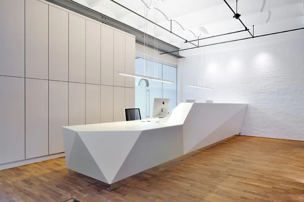 Der Wunsch der Nutzer war es, den industriellen Charme dieser ehemaligen Produktionsstätte weitgehend zu erhalten und mit zeitgemäßen Einbauten und Elementen zu ergänzen bzw. kombinieren. Der rechteckige Grundriss von gut 350 qm Fläche wurde entlang der Längsachse in 3 Zonen unterteilt. In der Mittelzone entstanden – eingefasst durch zwei parallel verlaufende Stahlunterzüge mit Stützenraster – der Empfangs- und Wartebereich. An dessen Ende befindet sich, durch eine frei stehende Wandscheibe verdeckt, der Zugang zu den beiden Arztzimmern im gläsernen Anbau des Gebäudes. In der hofseitigen Zone befinden sich die WCs für Patienten und Mitarbeiter, der Sterilisations-Bereich, Wirtschaftsraum, Eingriffsraum mit Schleuse sowie zwei weitere Behandlungsräume. Die dem Wasser zugewandte Zone beherbergt drei Kosmetikräume, Server-/Umkleideraum, Personalraum sowie einen speziellen Raum für die Cool-Sculpting-Behandlung, einem neuen Verfahren aus den USA zur Fettreduzierung an Problemzonen durch Kälte.