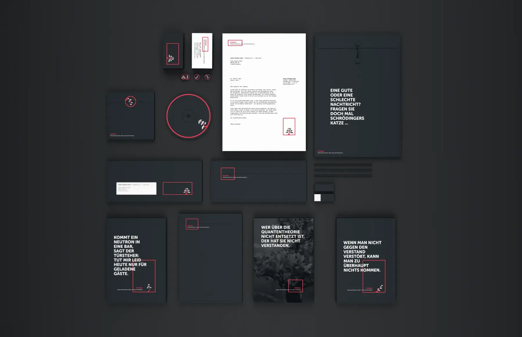 Bei näherer Betrachtung stellte sich schnell heraus, dass die theoretische Grundlage wie geschaffen war für ein flexibles Erscheinungsbild: Neutronen stecken voller Überraschungen, die Mitarbeiter der Forschungsgruppe ändern sich laufend, und auch der Bonsai, an den das Kürzel der Gruppe erinnert, kann in verschiedensten Gestaltungsformen auftreten – gleichzeitig bilden diese flexiblen Aspekte auch die Konstante der Forschungsgruppe. Es war also naheliegend, für Ponsai ein bewegtes Logo mit Variationsmöglichkeiten und hohem Wiedererkennungswert zu gestalten. Die Konstanten drücken sich sowohl im Bonsai als auch im Rahmen aus, der als eine Art Fenster Einblicke in die Gruppe erlaubt und zugleich dem immer wieder in unterschiedlichen Formen auftretenden Baum mit seinen flexiblen Neutronen-Blättern Halt gibt. Dabei ist aber auch der Rahmen selbst wandlungsfähig.