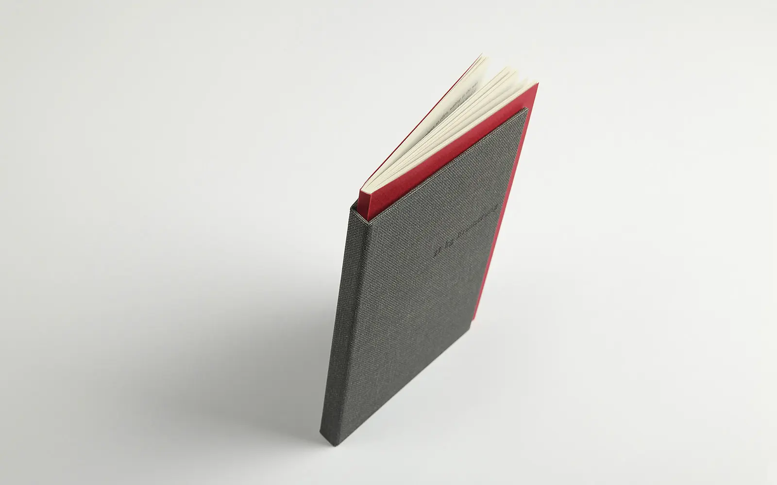 Der den Buchblock umgebende Hardcover-Einband ist nach Oben und Außen um 10mm gekürzt, der eingeklebte Buchblock schaut also, in Adaption an die Kollektion und deren ebenfalls rotes Innenfutter, ungeschützt aus dem Cover heraus.