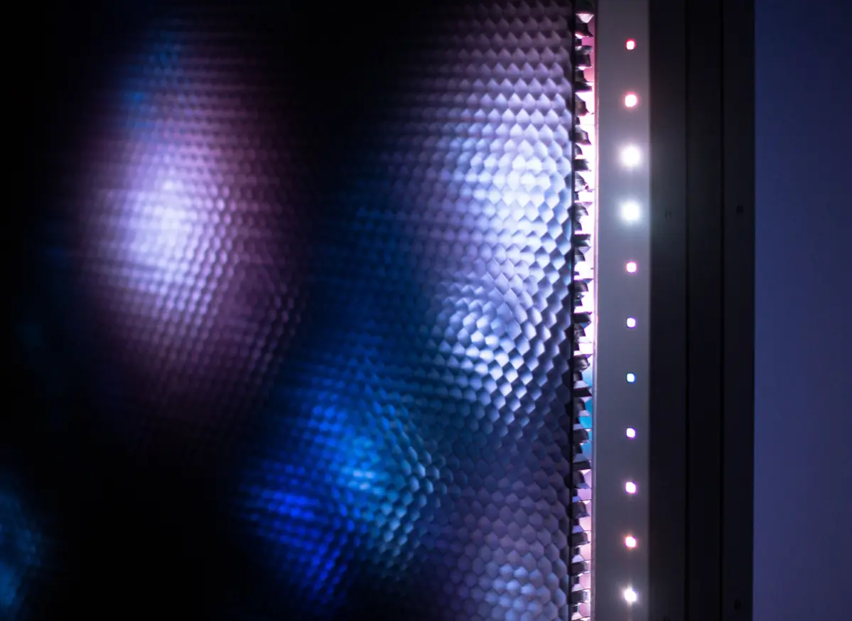 Den Effekt der Unschärfe bewirkt die Kombination einer LED Matrix von Alucobond Media® mit einer Aluminium Honeycomb Struktur von Bencore®. Beide Bestandteile für das Display stammen aus unserem Color Material & User Interface Lab.