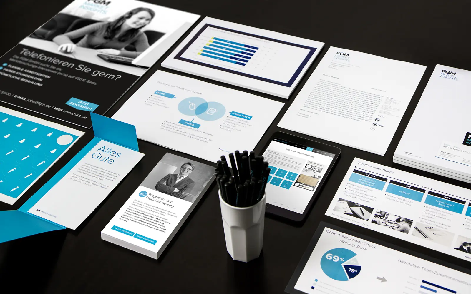Das Leipziger Full-Service-Institut FGM ist kreativ, präzise und lösungsorientiert. Es braucht für seine Kommunikation ein Design das auf den Punkt kommt. Und eins, was dabei hochkomplexe Zusammenhänge wissenschaftlich korrekt und verständlich darstellt. Wir entwickelten mit unserem Auftraggeber gemeinsam die FGM als neue Marke. Geradlinig, wertvoll, ohne Schnickschnack. Aber mit Raffinesse. Umgesetzt auf hochwertigen Materialien. Herausragend im Marktforschungsmarkt. Das passt zur FGM. In unserem Ergebnisbericht steht: Wir sind stolz, wir haben viel gelernt und es hat Spaß gemacht. Zufriedenheitsquote: Hundert Prozent.
