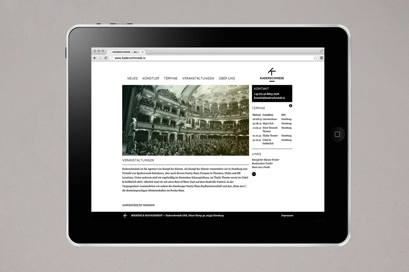 Die Kaderschmiede versteht sich als Agentur für Spokenword-Künstler. Und zwar den besten der Poetry Slam Szene. Denn als erste deutsche Agentur für Poetry Slam Künstler entspringt sie direkt dem größten Slamveranstalter “Kampf der Künste”.