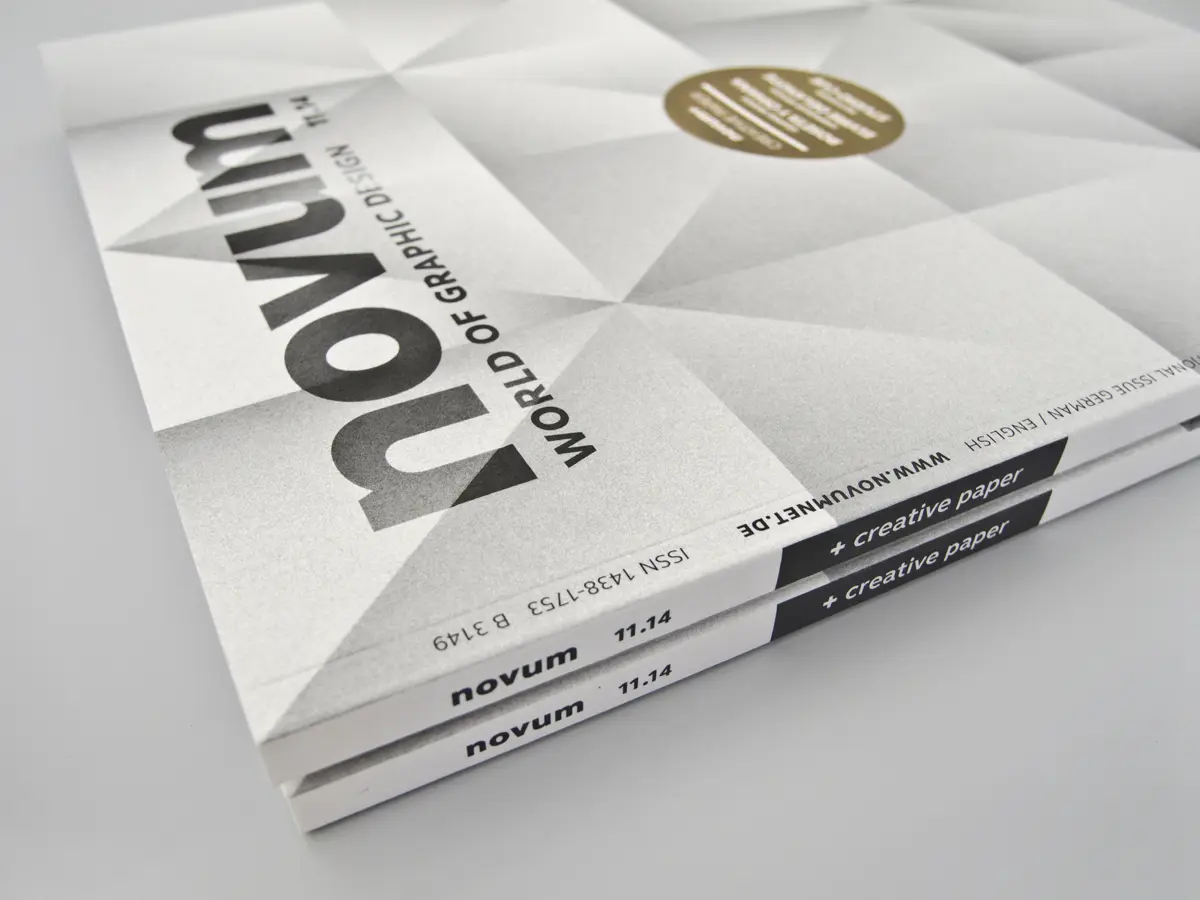 Wir wollten das Thema »Papier« haptisch visualisieren und das Naturpapier mit seiner besonderen Oberflächenstruktur wirken lassen. Der visuelle Eindruck von gefaltetem Papier wird durch eine Blindprägung der Kanten verstärkt hervorgehoben. Die Kombination mit der Heißfolienprägung bildet einen schönen Kontrast.