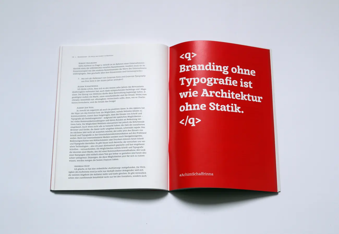 Teil dieser Arbeit ist eine Expertenbefragung nach der Bedeutung der Schrift im Branding. Interviewpartner: Achim Schaffrinna, Alber-Jan Pool, Andreas Koop, Christoph Koeberlin, Erik Spiekermann, Holger Schmidhuber, Indra Kupferschmid, Jürgen Huber, Ludwig Übele und Robert Paulmann.
