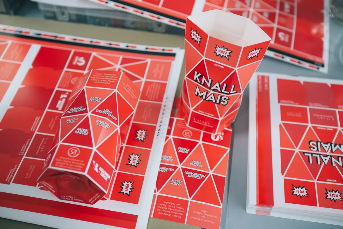 Sechs Studenten des Studiengangs Druck- und Medientechnologie, der Hochschule der Medien in Stuttgart, produzierten im Rahmen des technischen Projektes Offset eine Popcorn Lebensmittelverpackung. Das Produkt wurde im Rahmen eines studentischen Projektes in einem nicht kommerziellen Umfeld umgesetzt.
